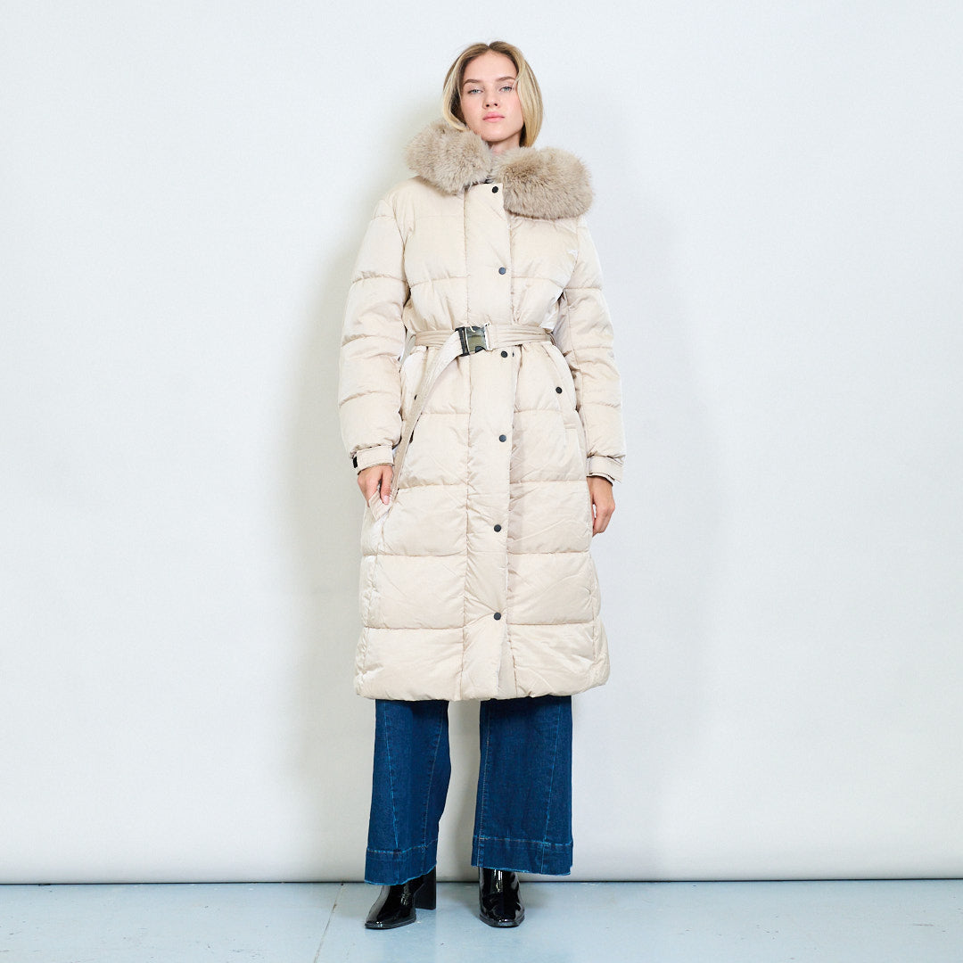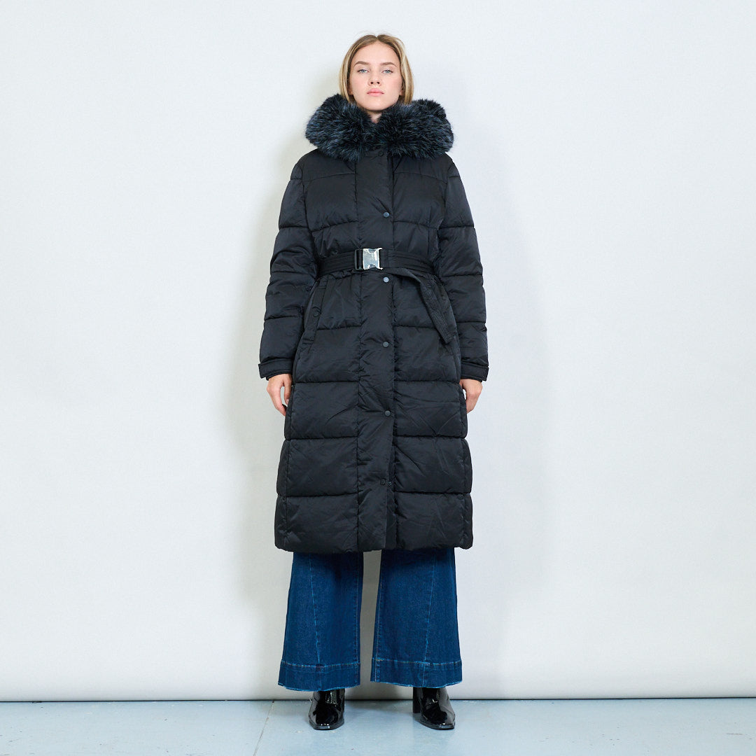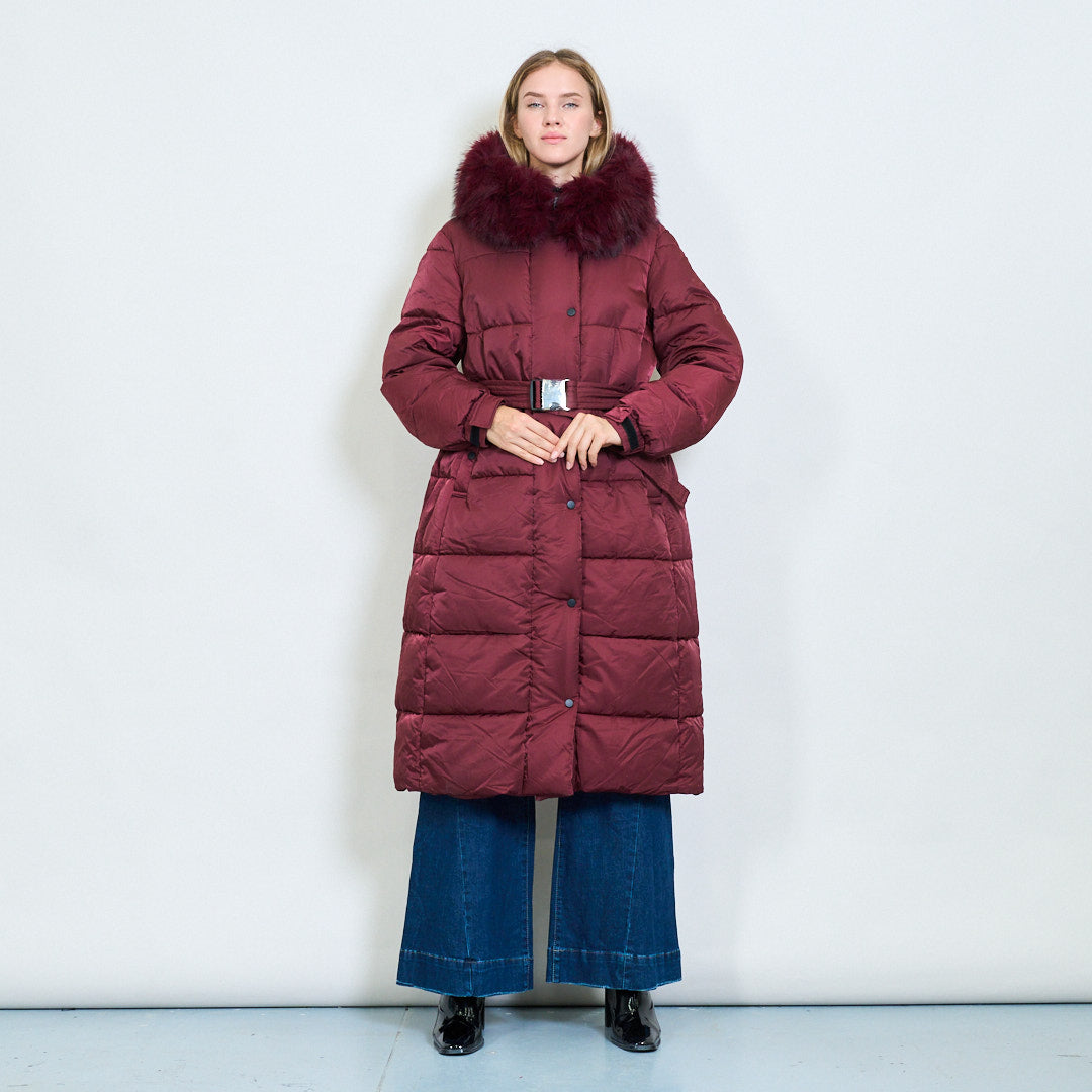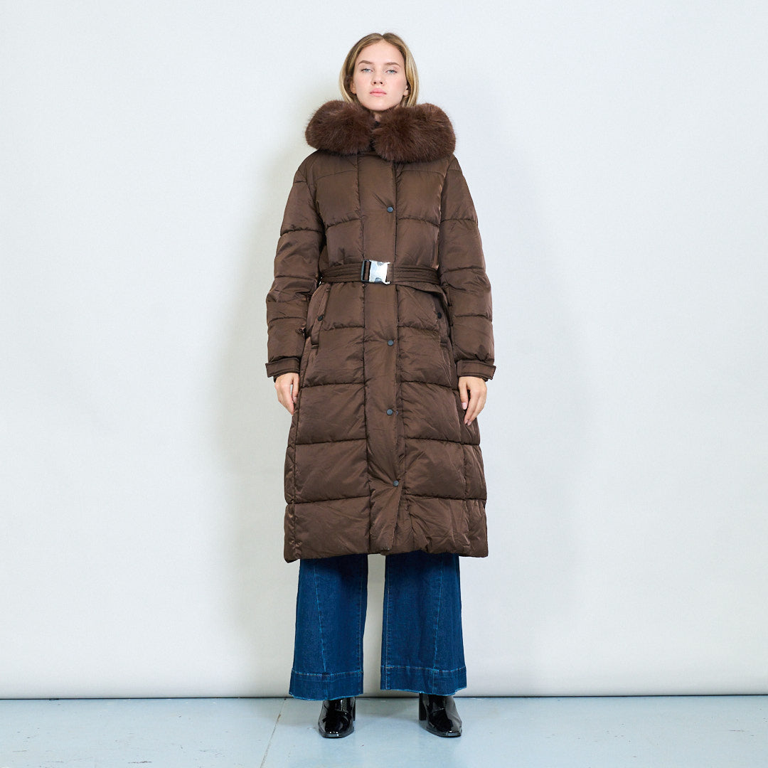 Garš stepēts jostas mētelis ar mākslīgo kažokādu kapuci vairumtirdzniecībā