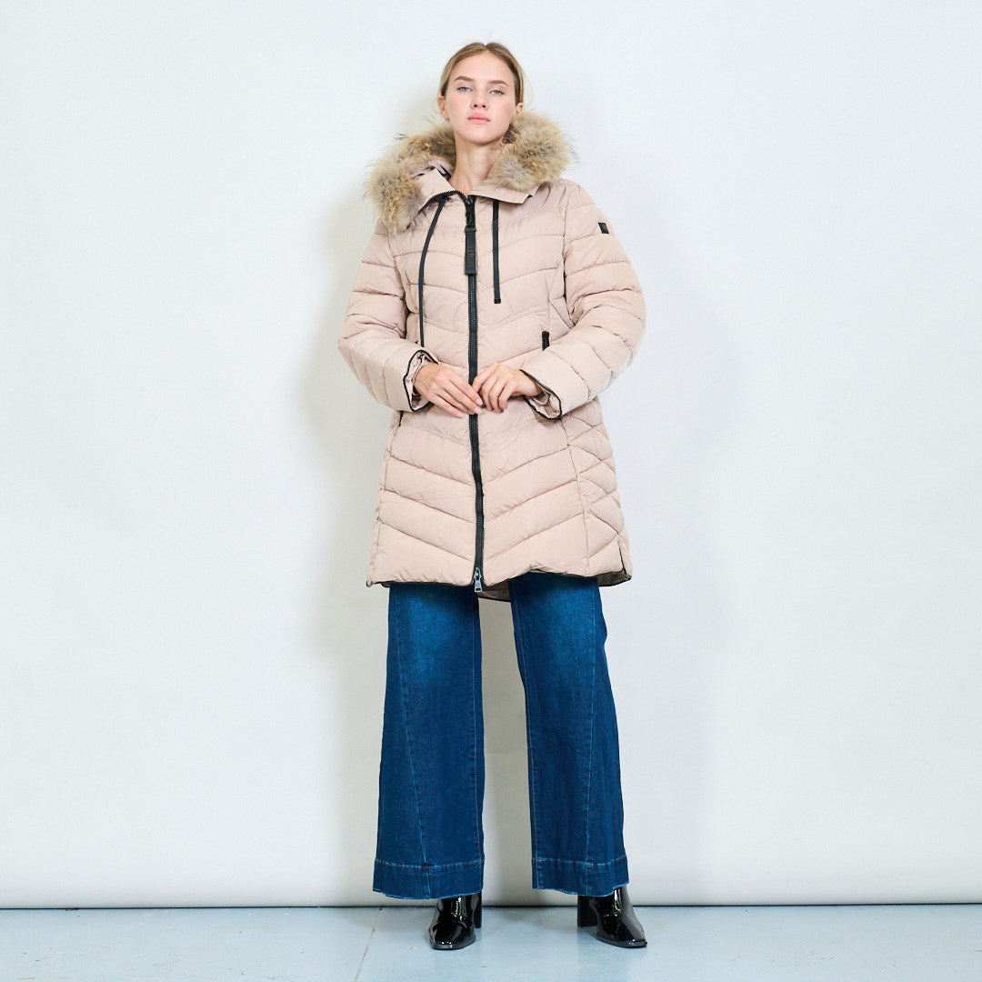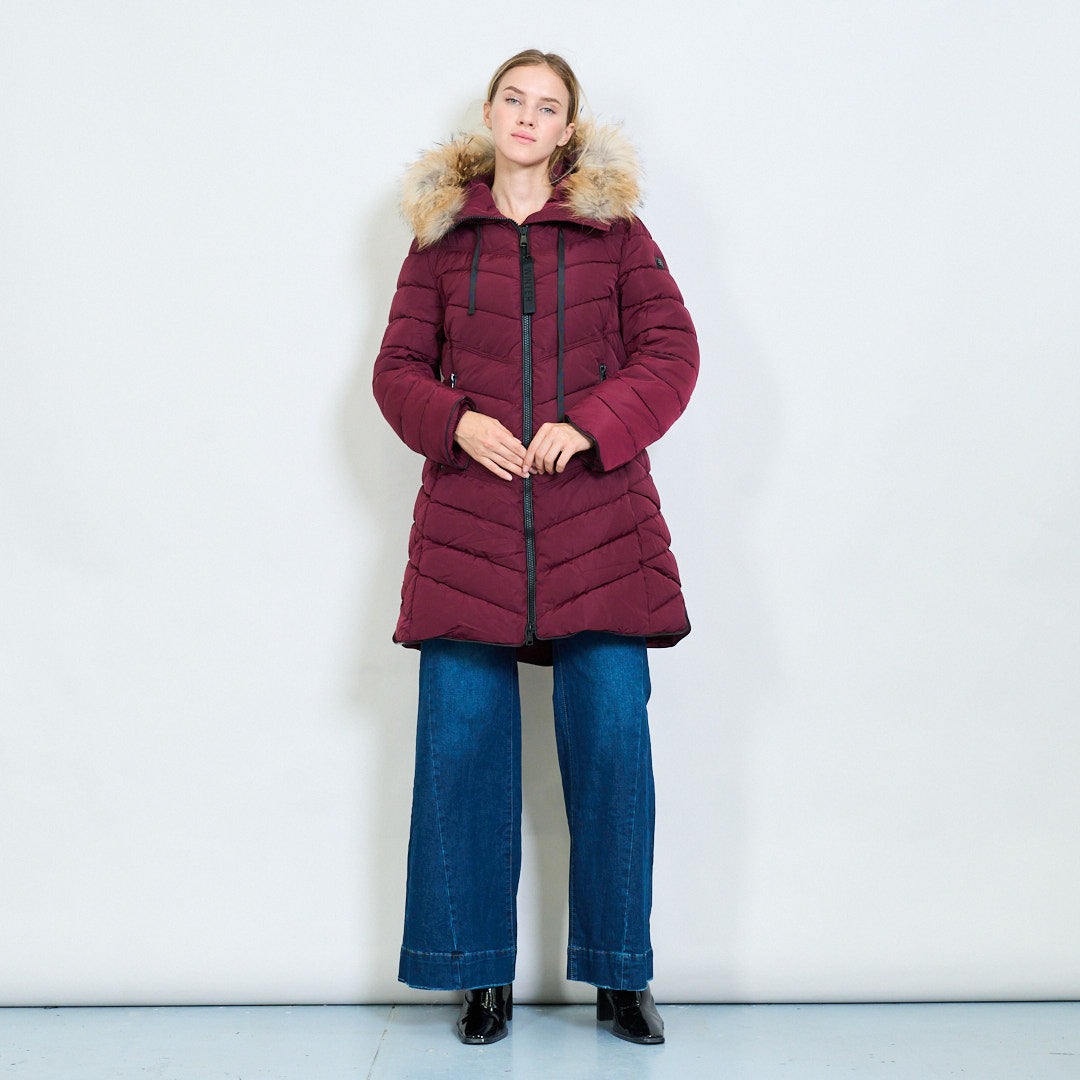Stepēta kapuces mētelis ar mākslīgās kažokādas apdari un kontrasta rāvējslēdzēja detaļu vairumtirdzniecība