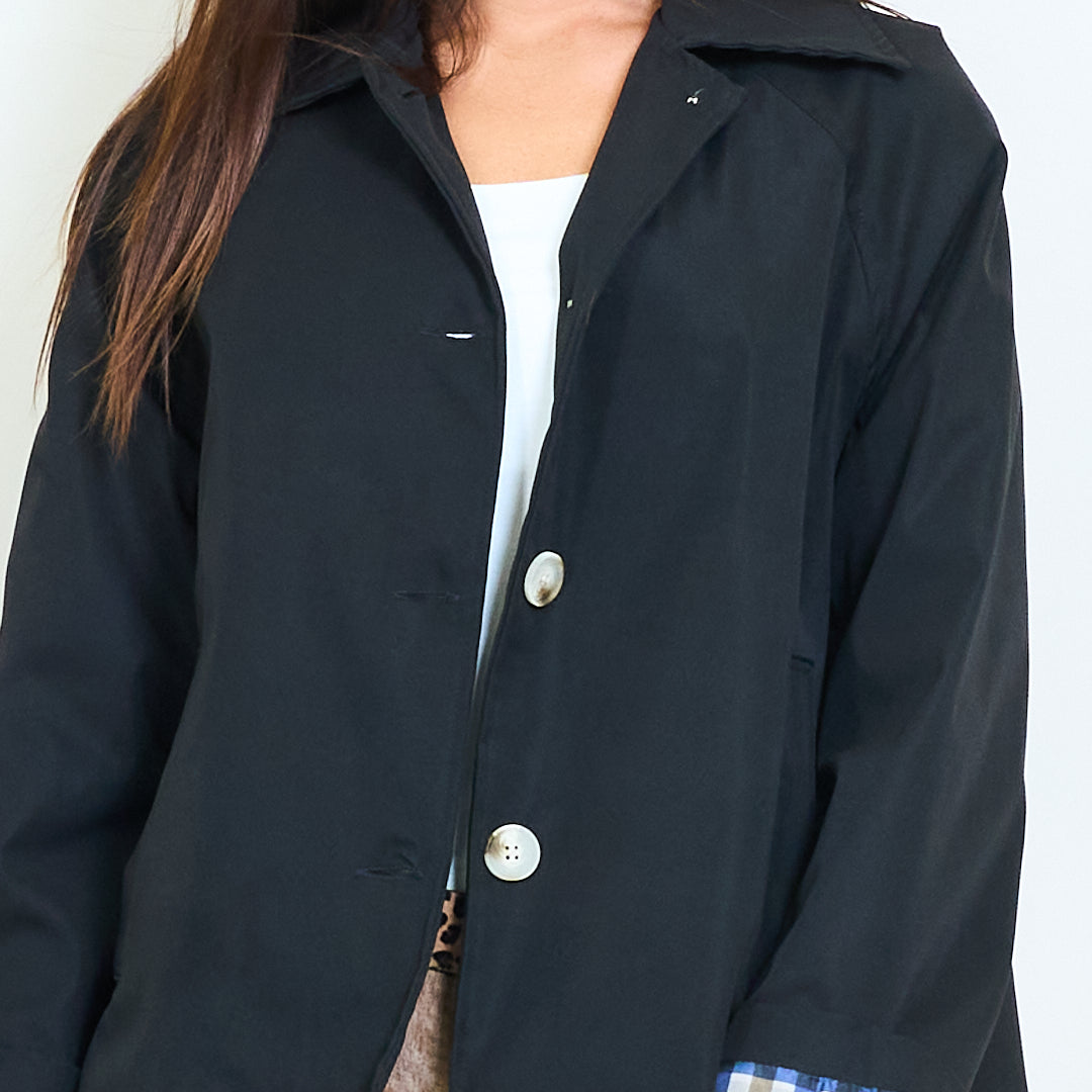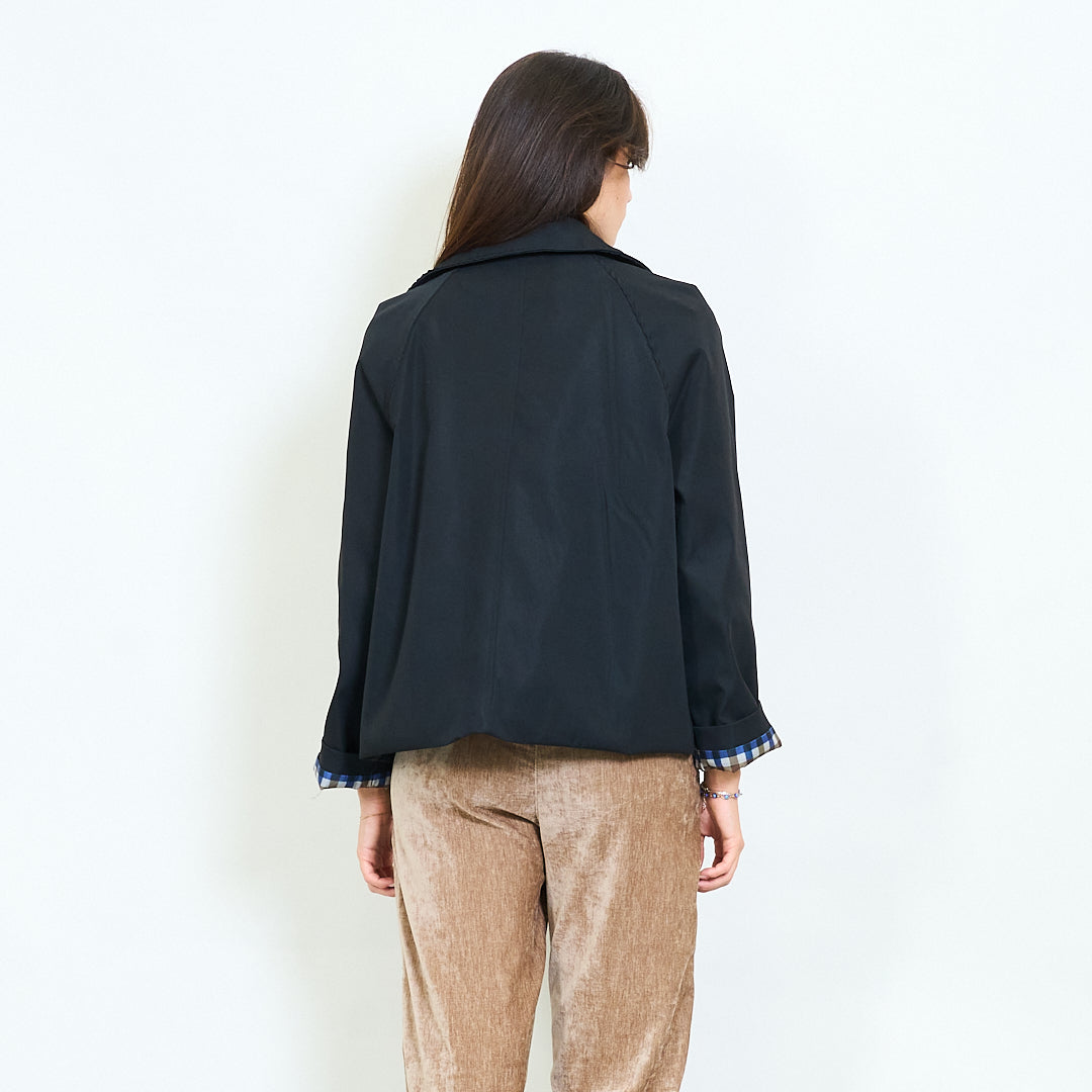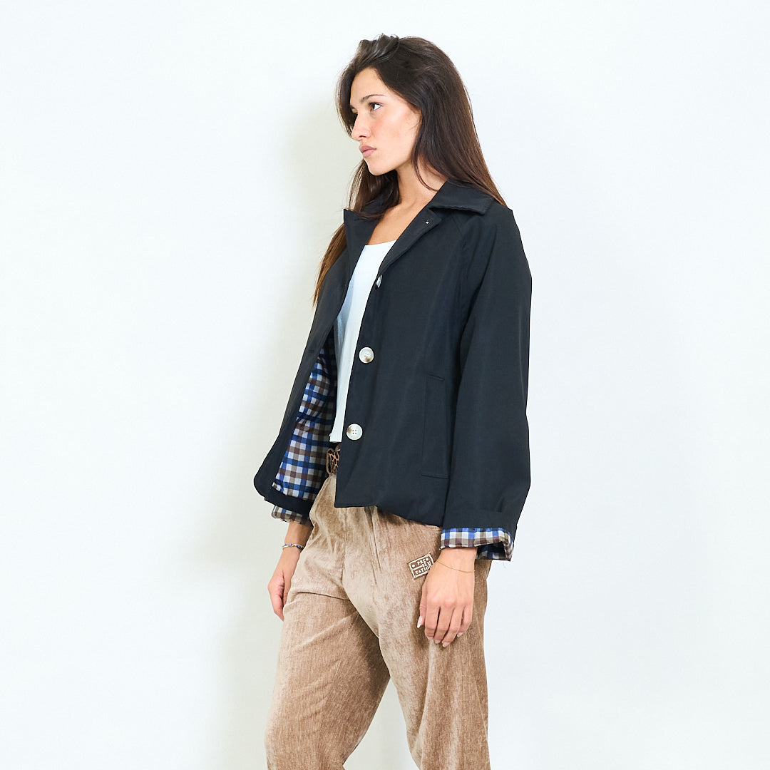 Īsa pogas uz augšu melna jaka ar kontrasta pogām vairumtirdzniecībā