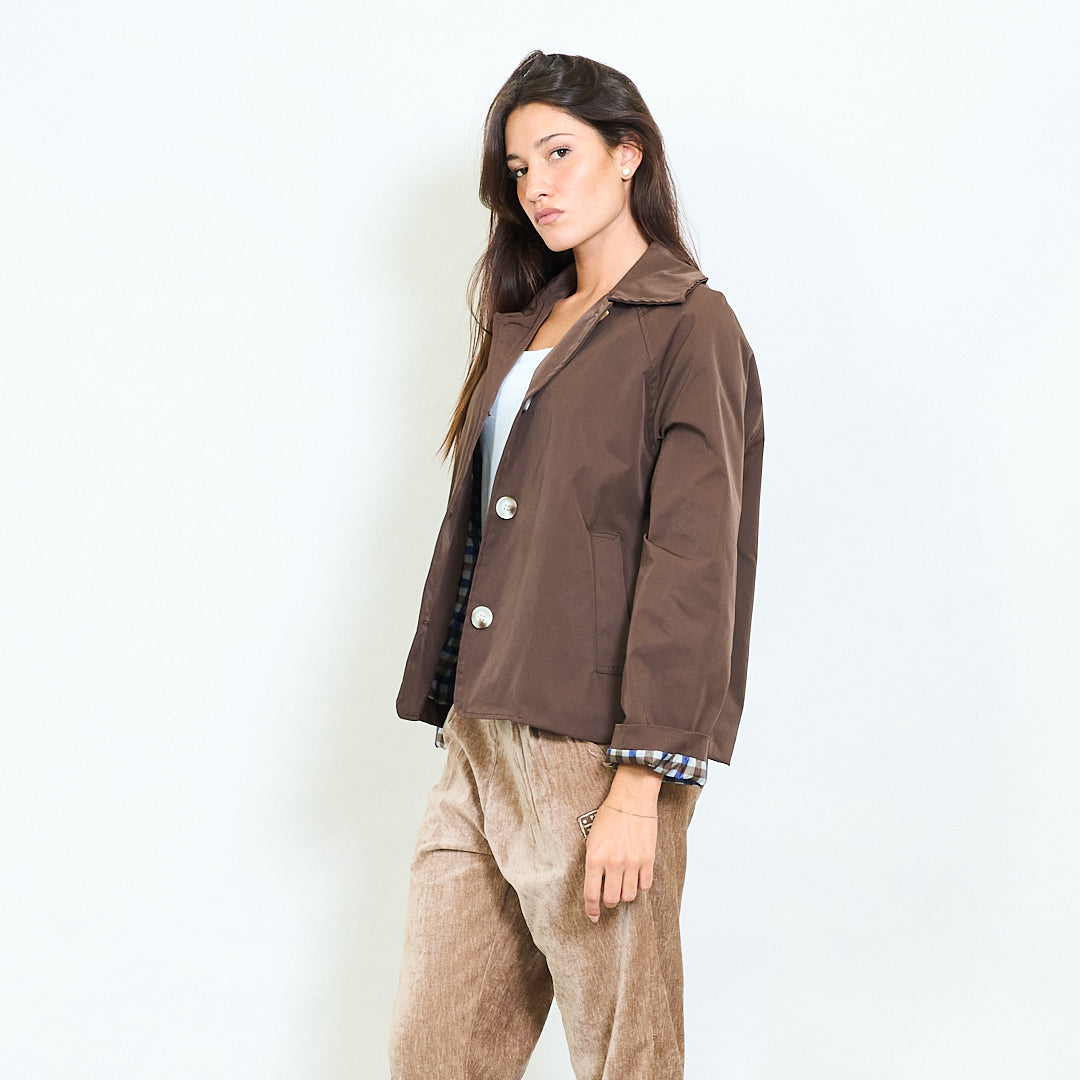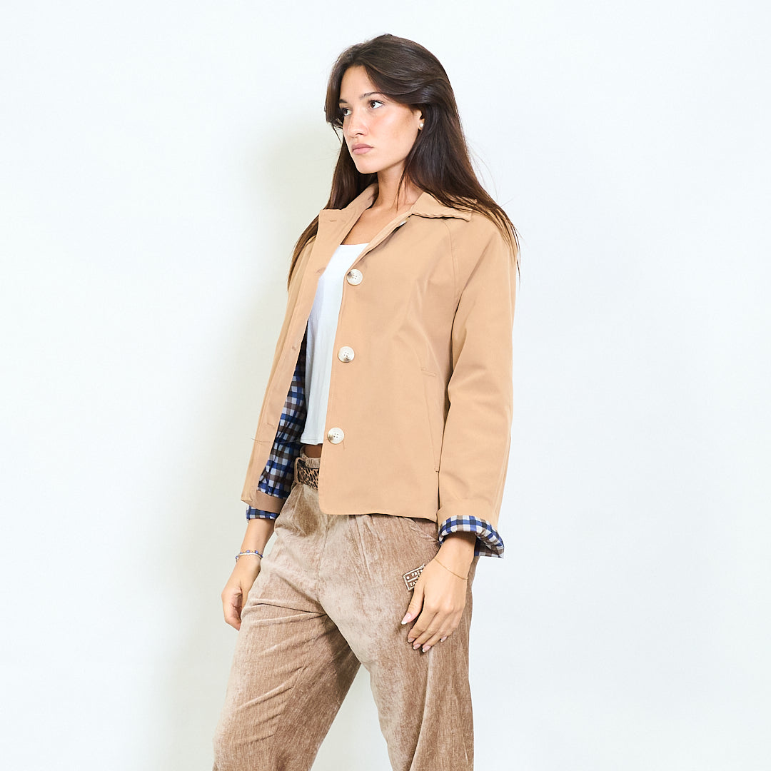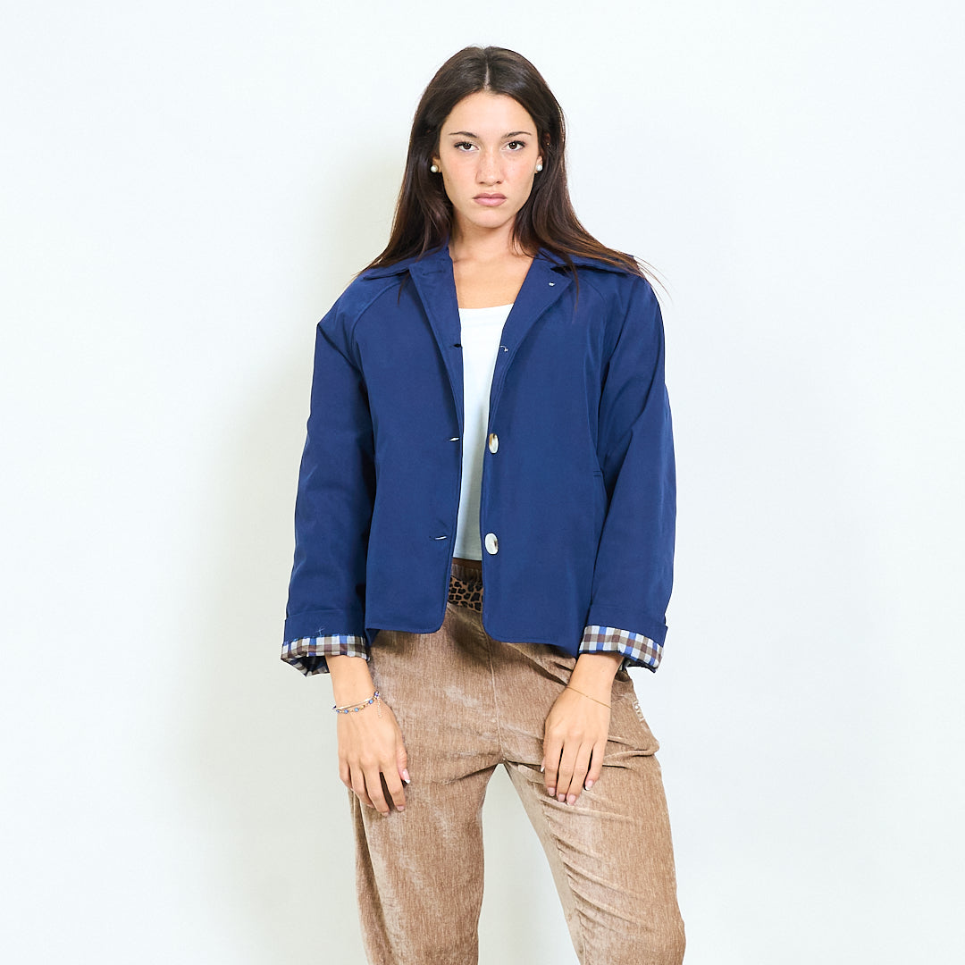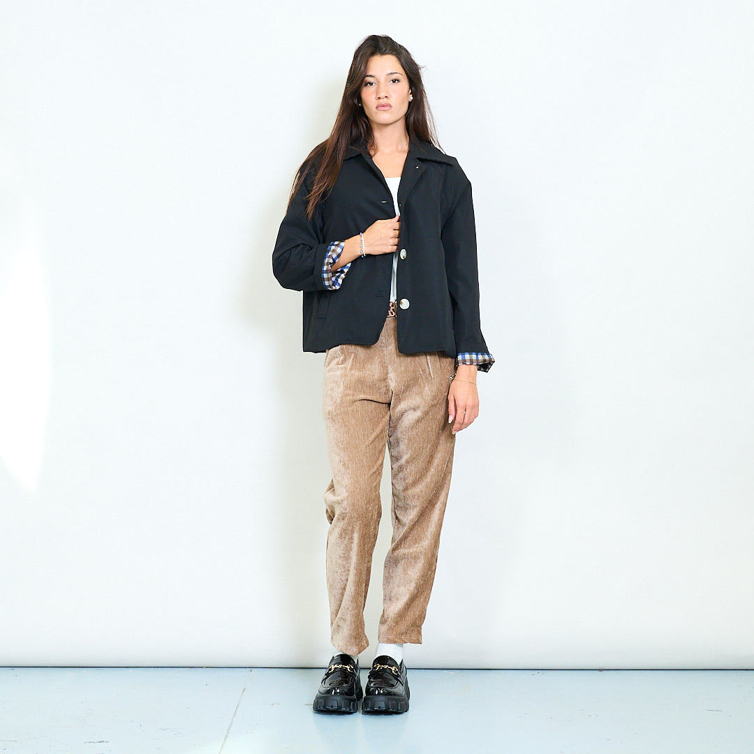 Īsa pogas uz augšu melna jaka ar kontrasta pogām vairumtirdzniecībā