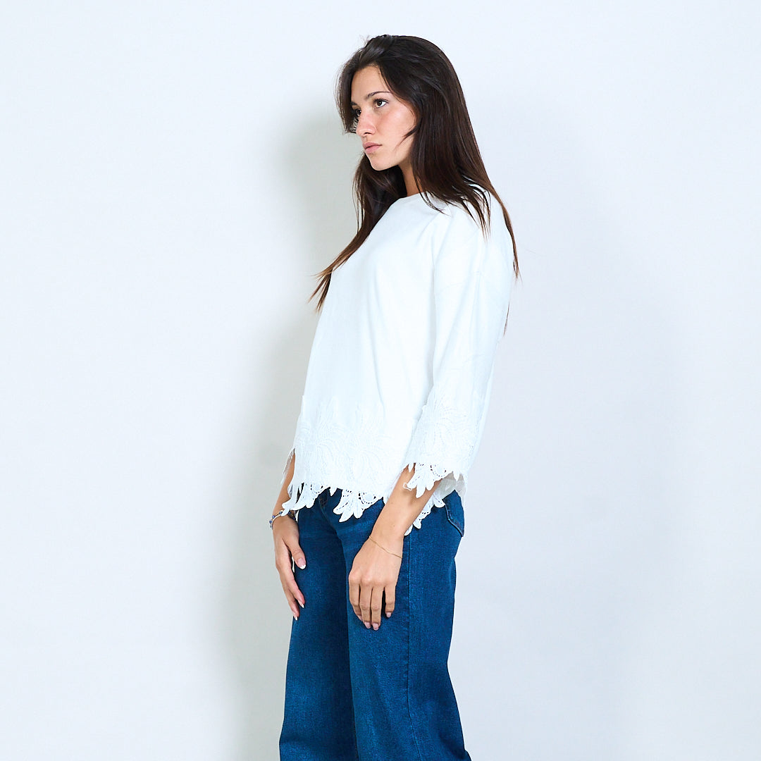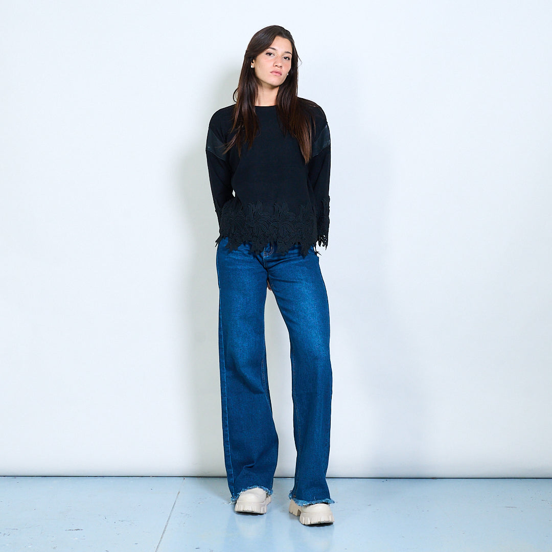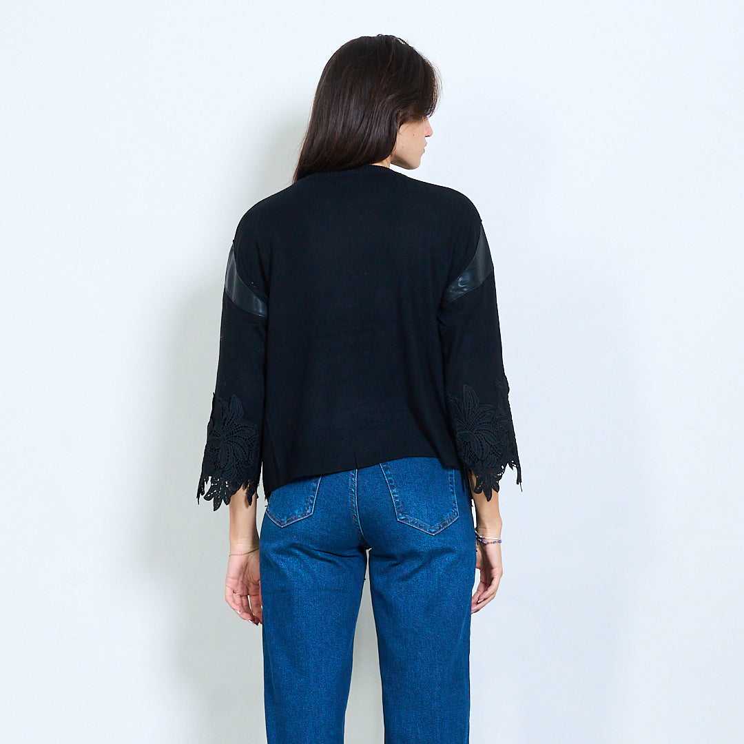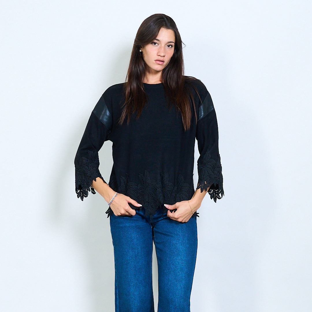 Mežģīņu hem džemperis ar mākslīgās ādas plecu detaļu vairumtirdzniecību