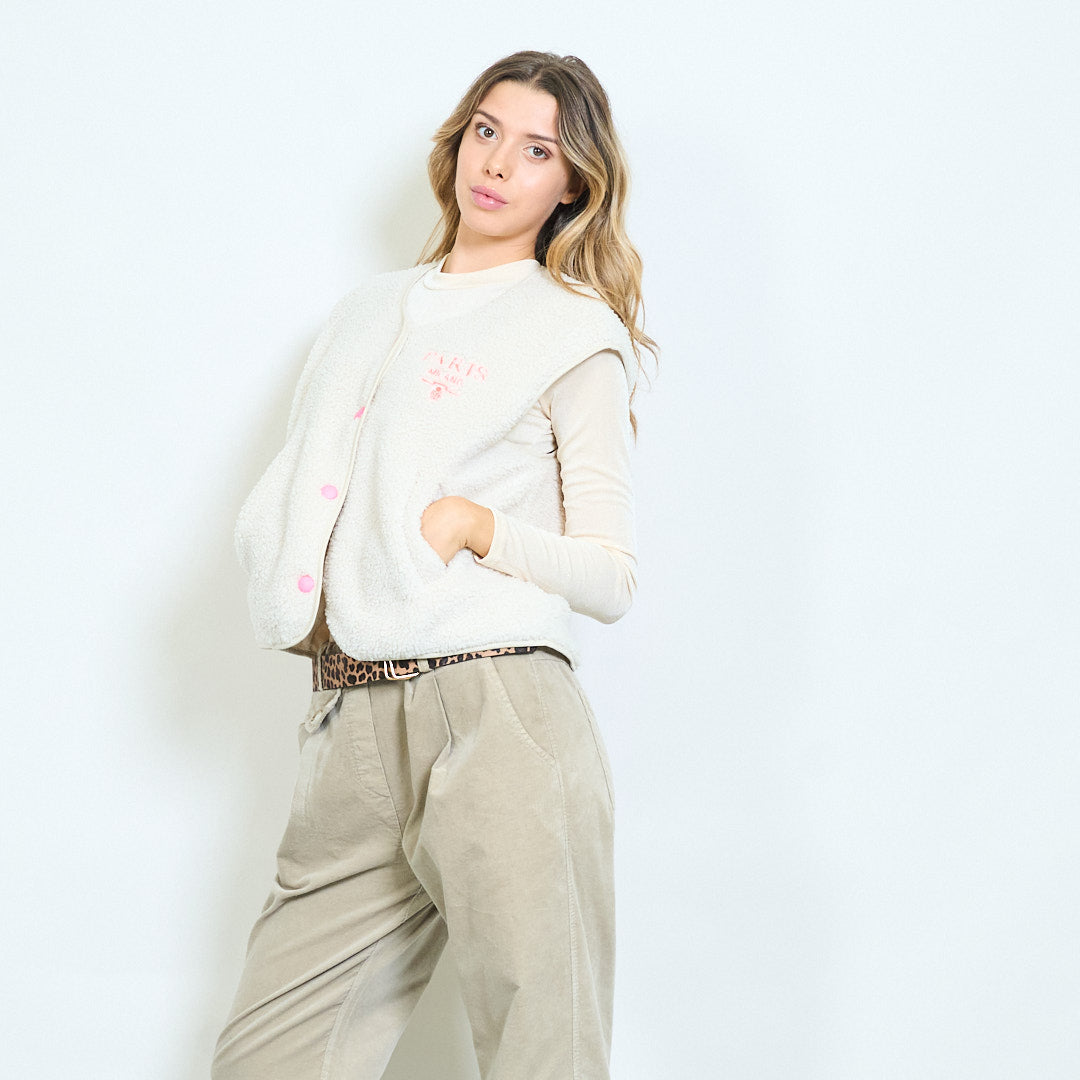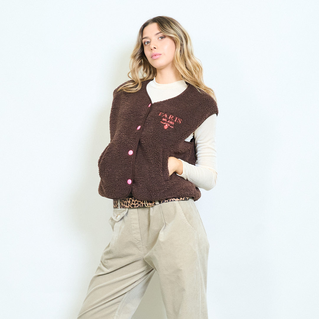- Mājīga bez piedurkņu veste, kas izstrādāta ar mīkstu vilnas tekstūru, lai siltu sajūtu