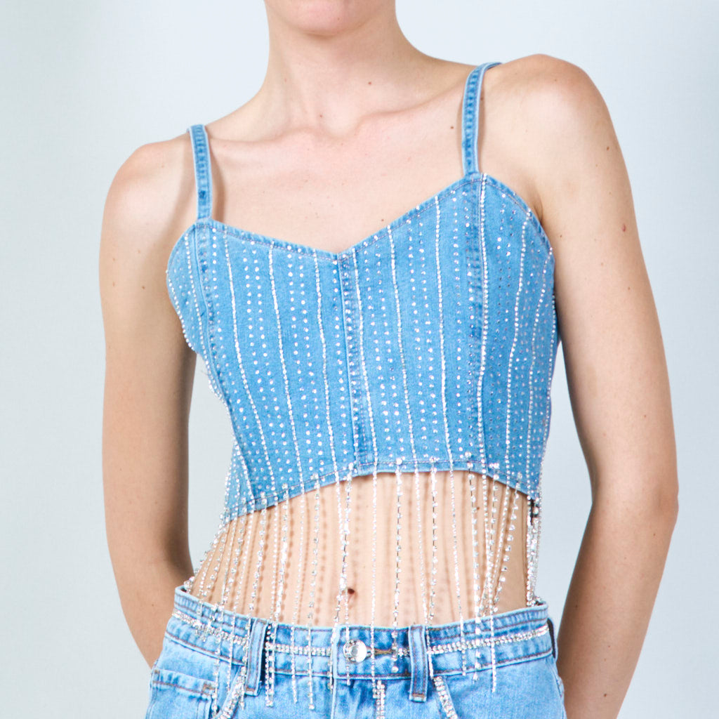 Izrotāts džinsa ražas augšdaļa ar bārkstīm detaļu vairumtirdzniecību