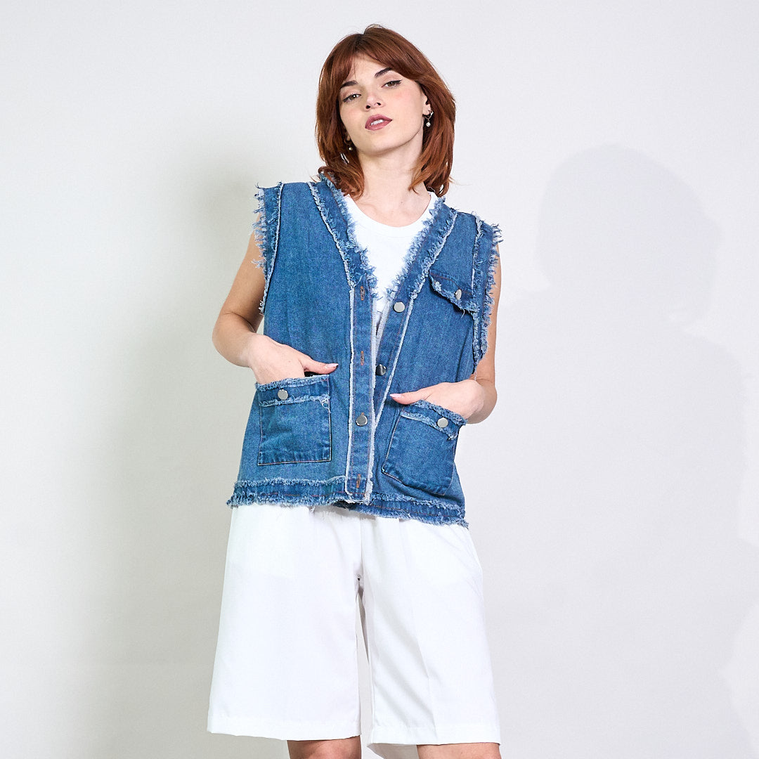 Neapstrādāta bārkstis apdare ar daudzām kabatas bez piedurknēm džinsa vestes vairumtirdzniecība