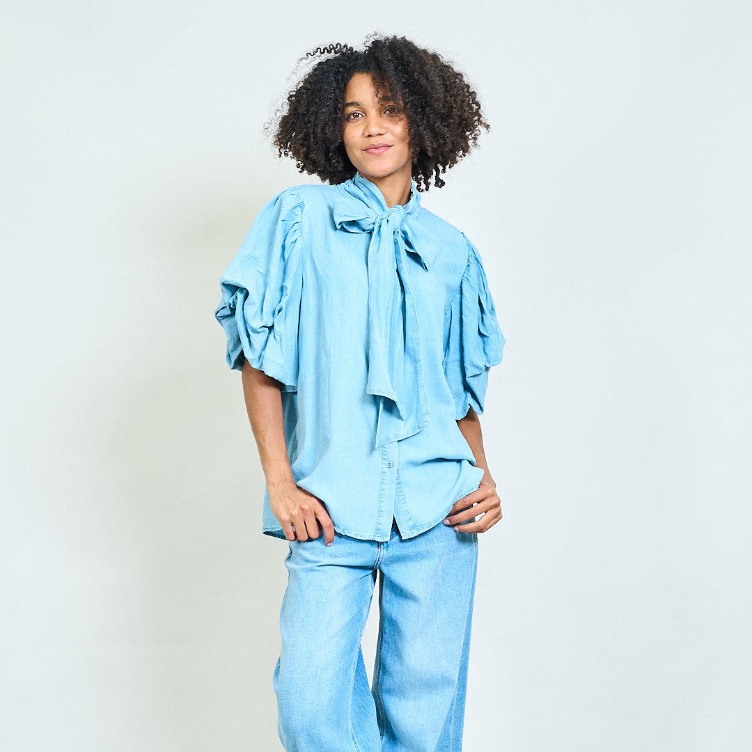 - Sievišķīga blūze ar ruched pleciem un apjomīgām piedurknēm
