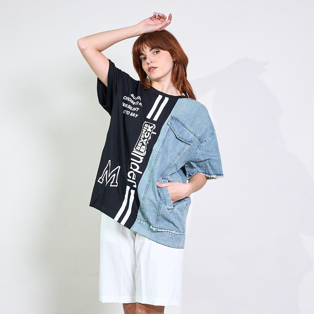 - Unikāls pusotra dizains ar kokvilnas kreklu un džinsa audumu