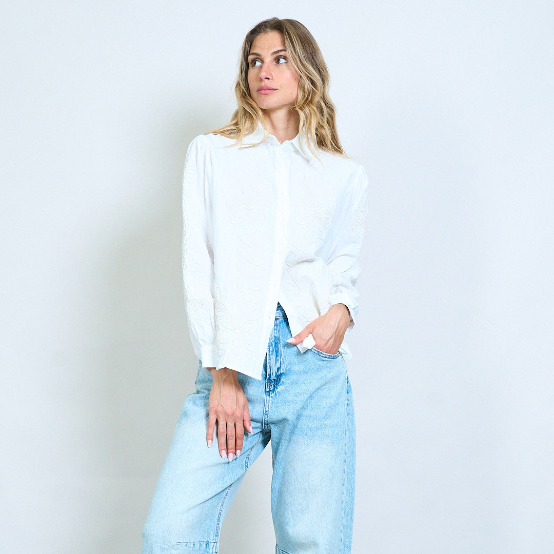 - Eleganta blūze ar paaugstinātu ziedu izšuvumu priekšpusē un piedurknēs
