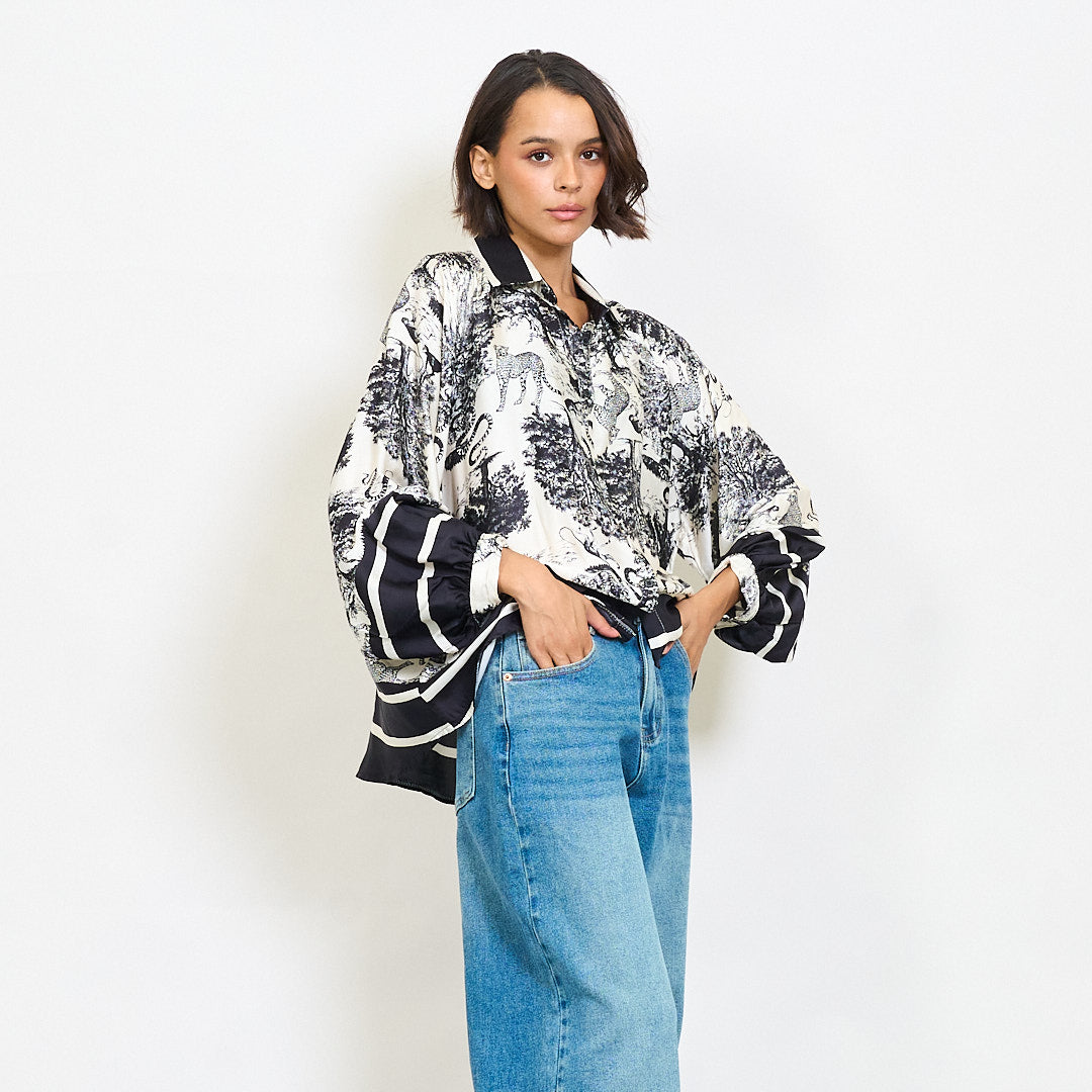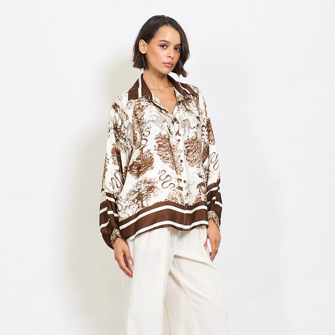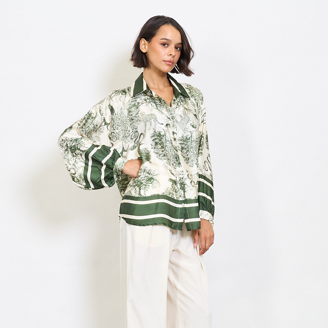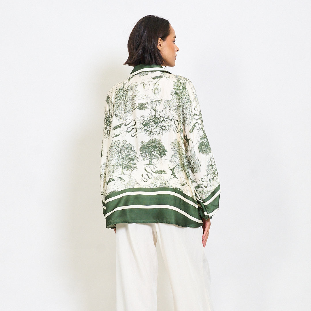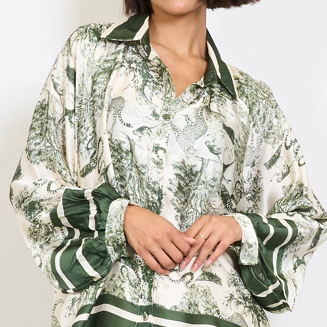 - Elegants satīna krekls ar sarežģītu dzīvnieku un meža ainavas izdruku