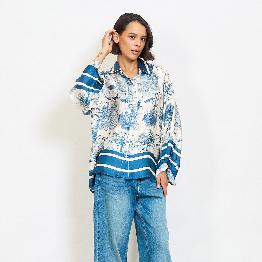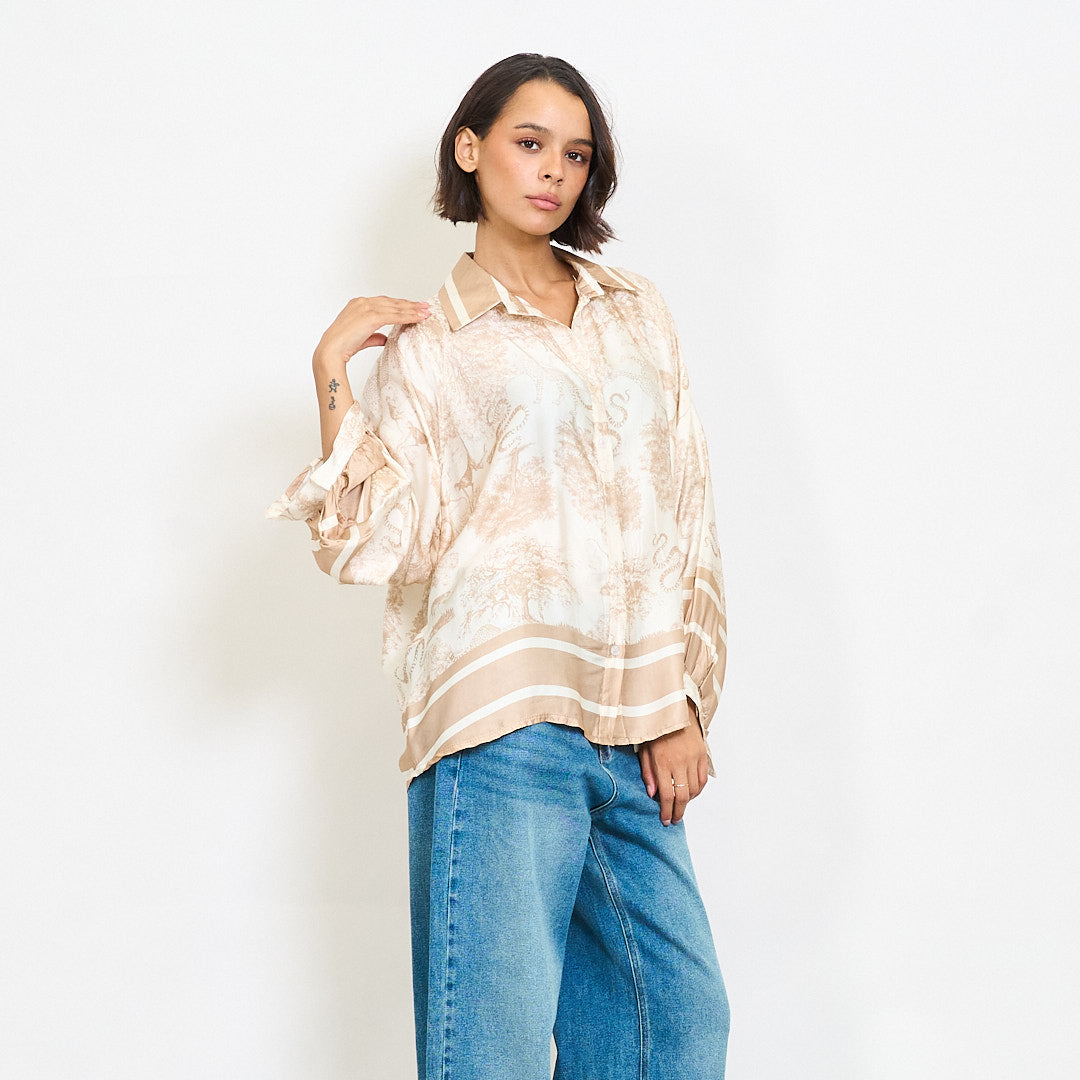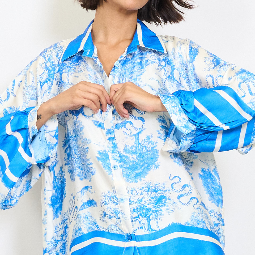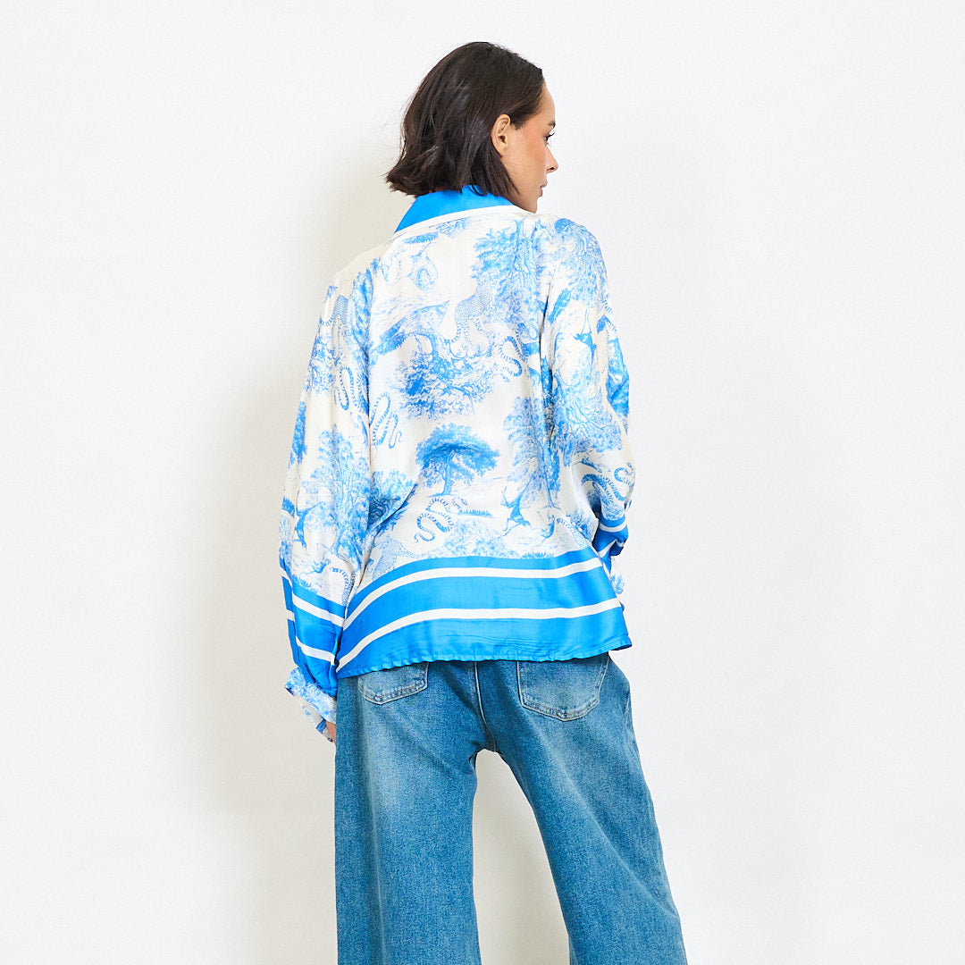 - Elegants satīna krekls ar sarežģītu dzīvnieku un meža ainavas izdruku