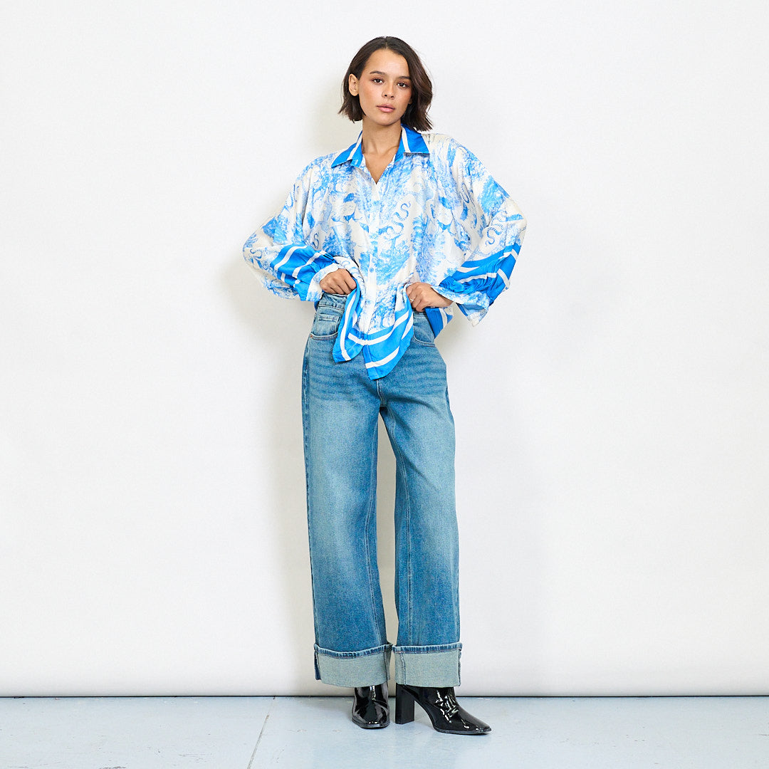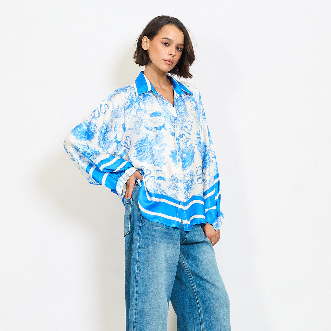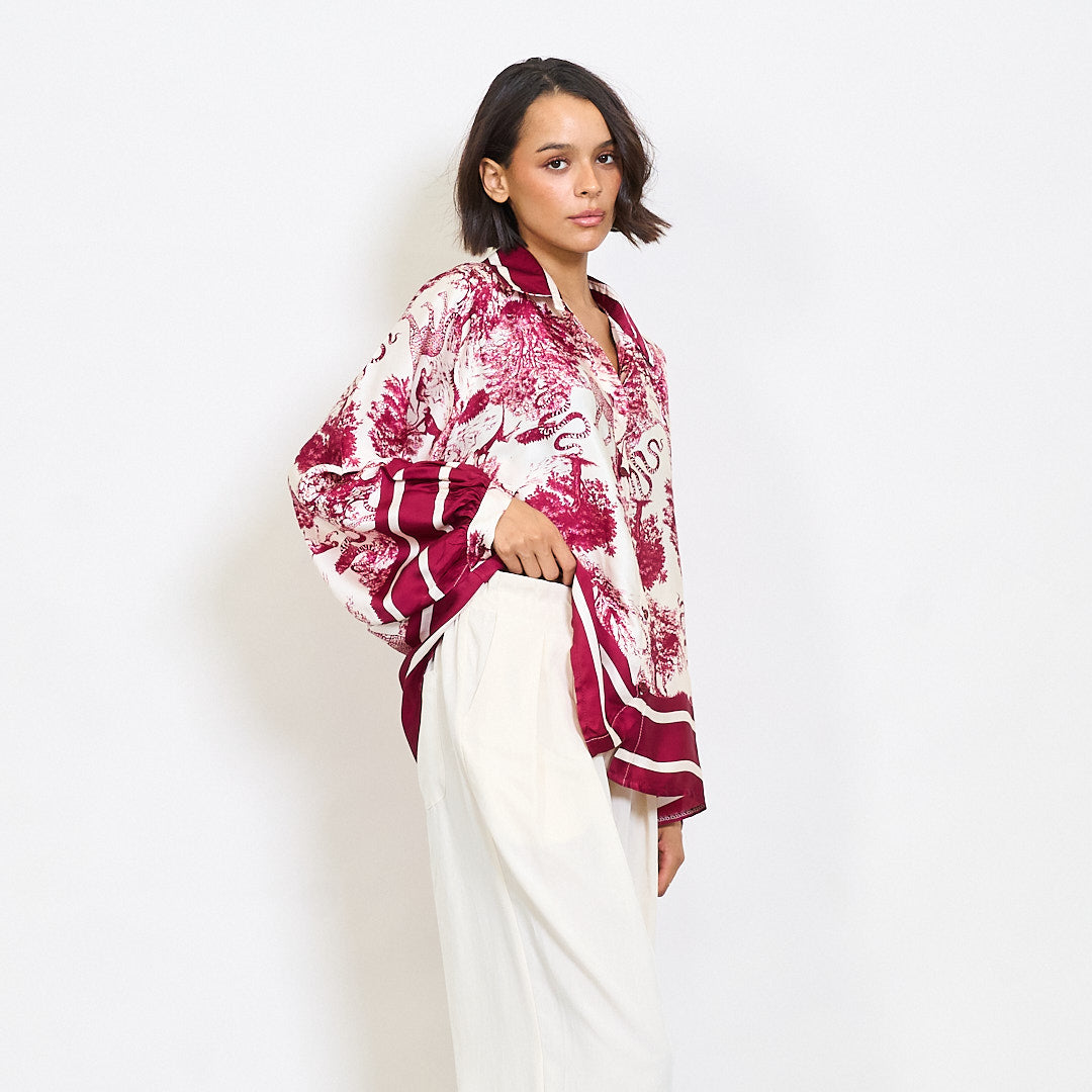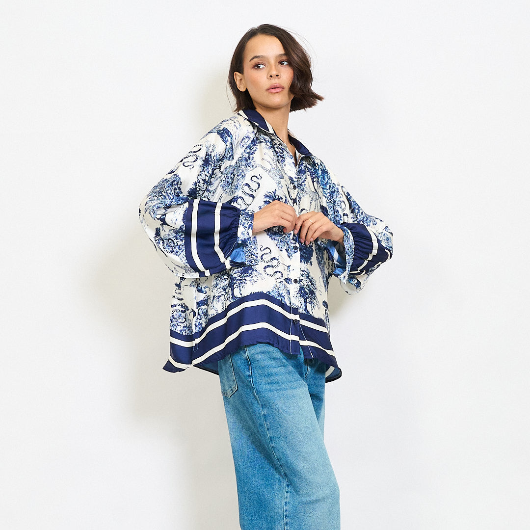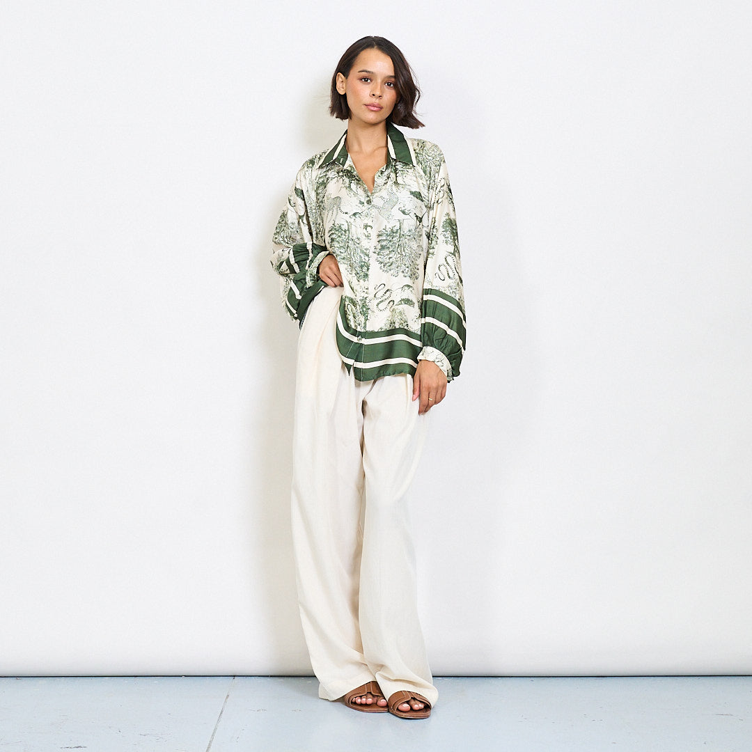 - Elegants satīna krekls ar sarežģītu dzīvnieku un meža ainavas izdruku