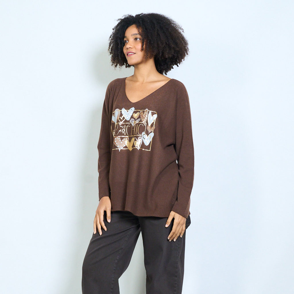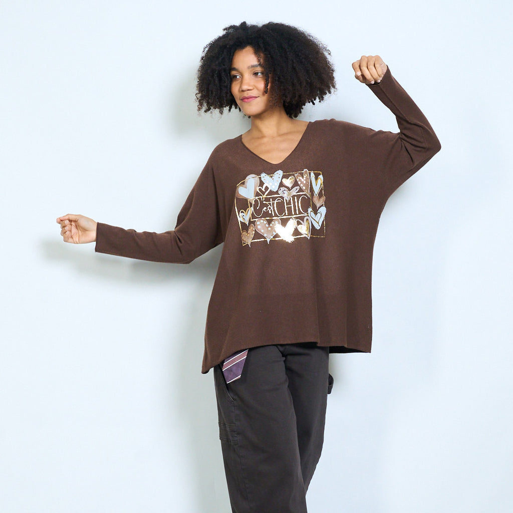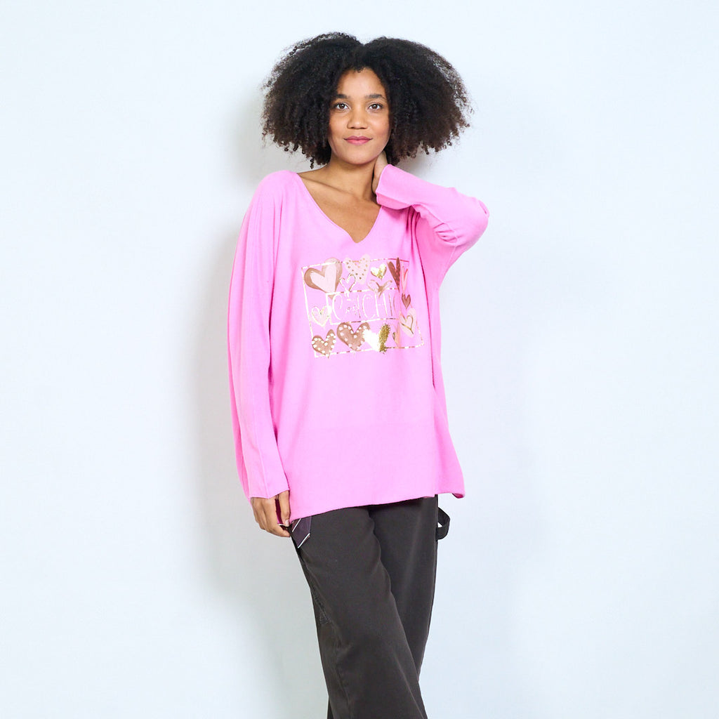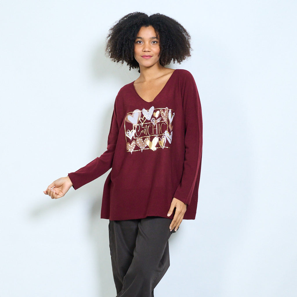 Sirds grafiks "C’est chic" ar V veida kakla izgriezumu, brīvs trikotāžas tops vairumtirdzniecība