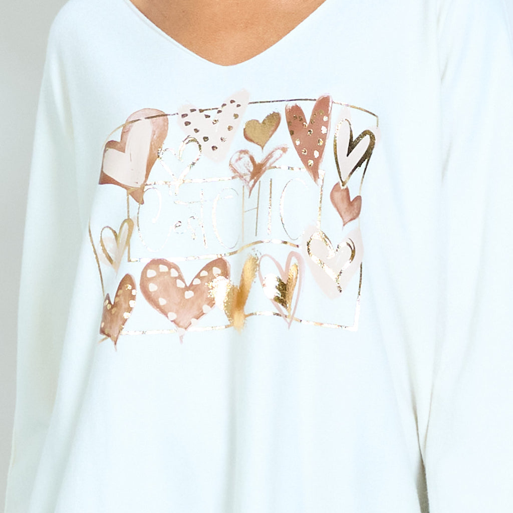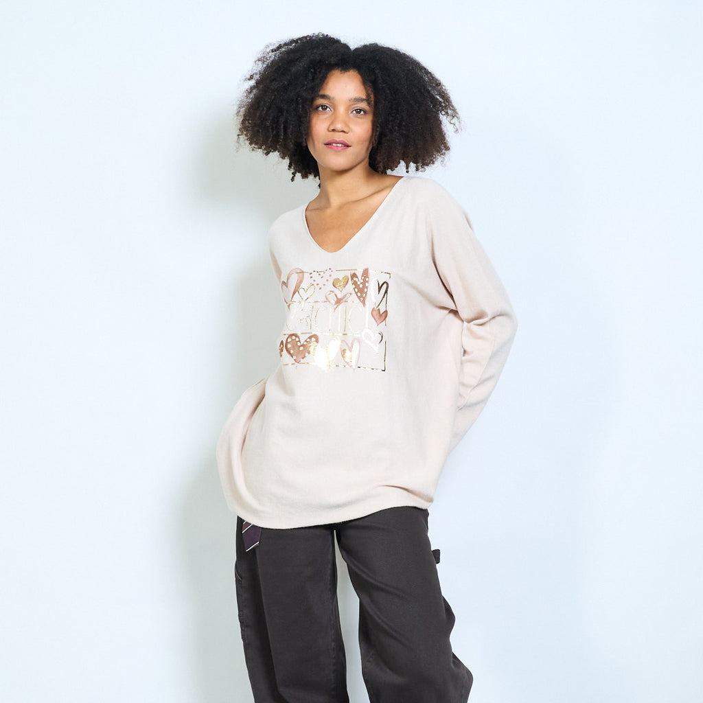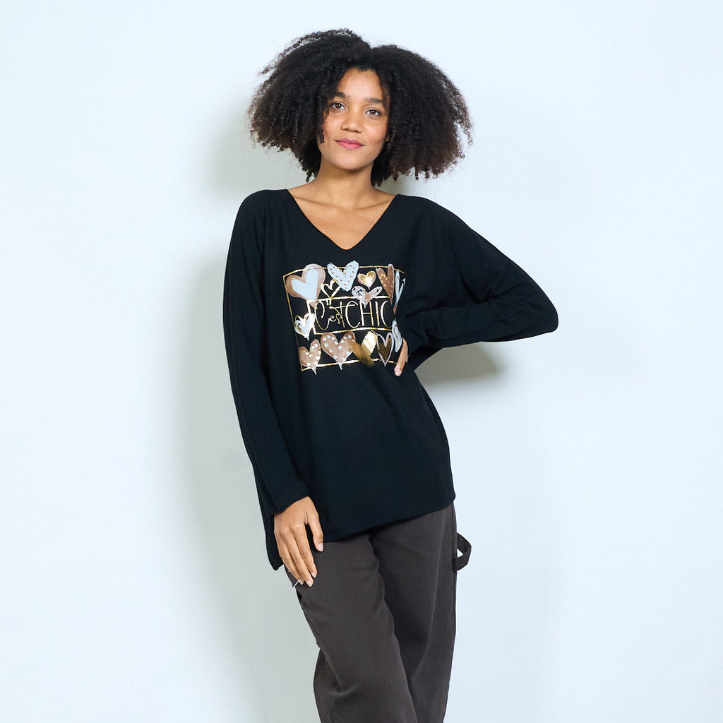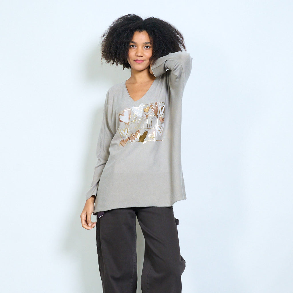 Sirds grafiks "C’est chic" ar V veida kakla izgriezumu, brīvs trikotāžas tops vairumtirdzniecība
