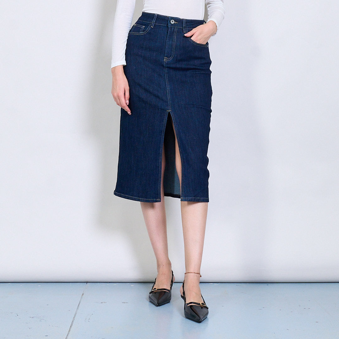 Hoog getailleerde stretch denim kokerrok met rugsplit groothandel