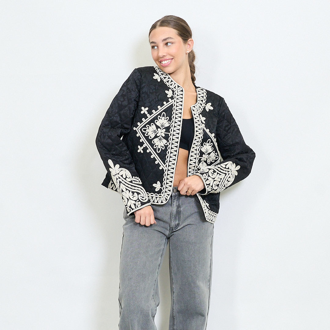 Gequilt open front jas met barokke bloemendriehoek borduurwerk en touwafwerking groothandel