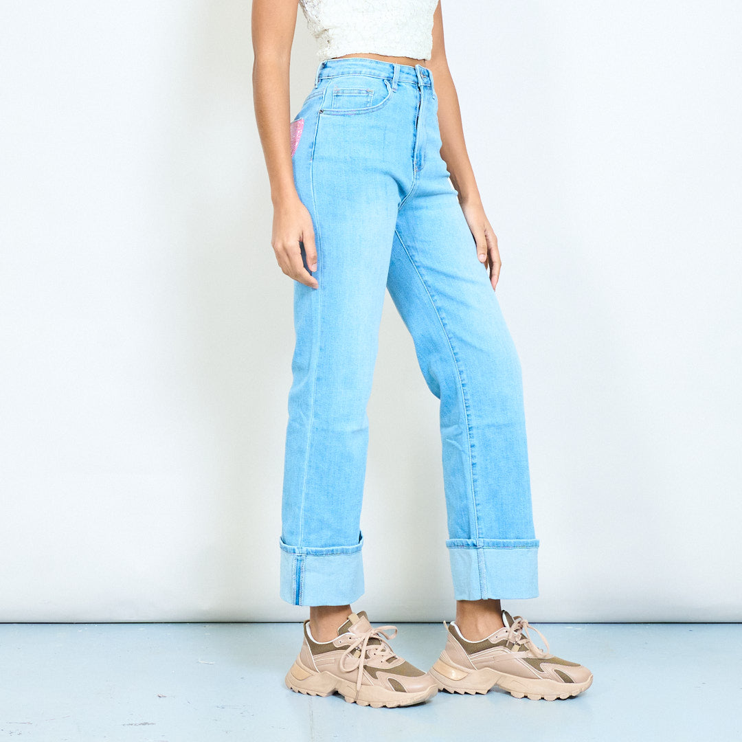 Groothandel in gewassen denimjeans met hoge taille, rechte pijpen en manchetten