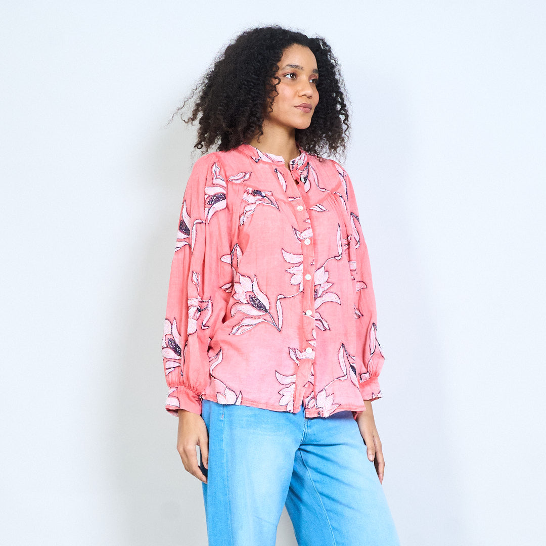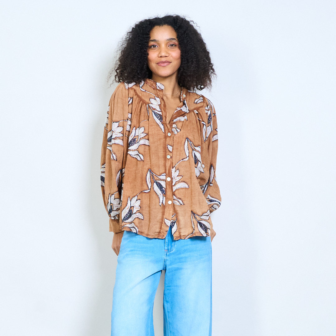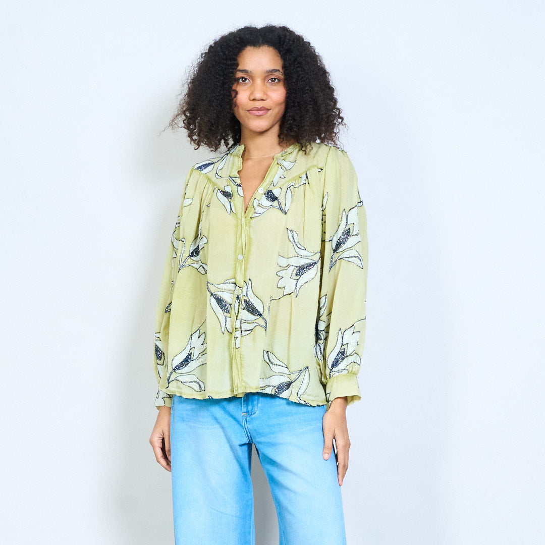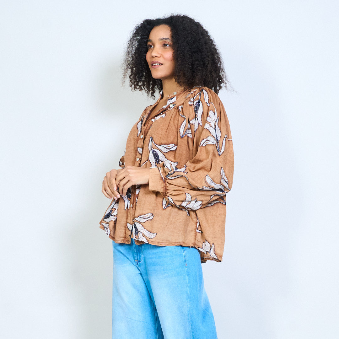 Groothandel in blouses met abstracte bloemenprint en verzamelde lange mouwen
