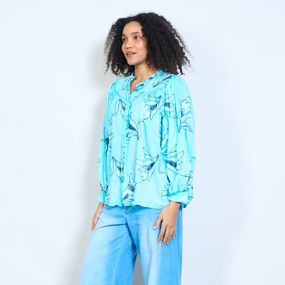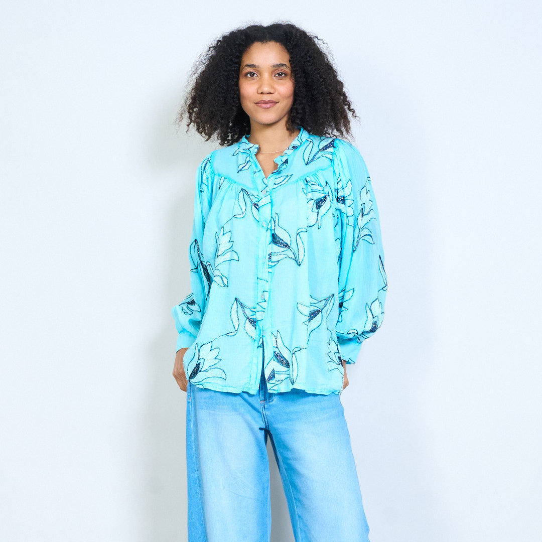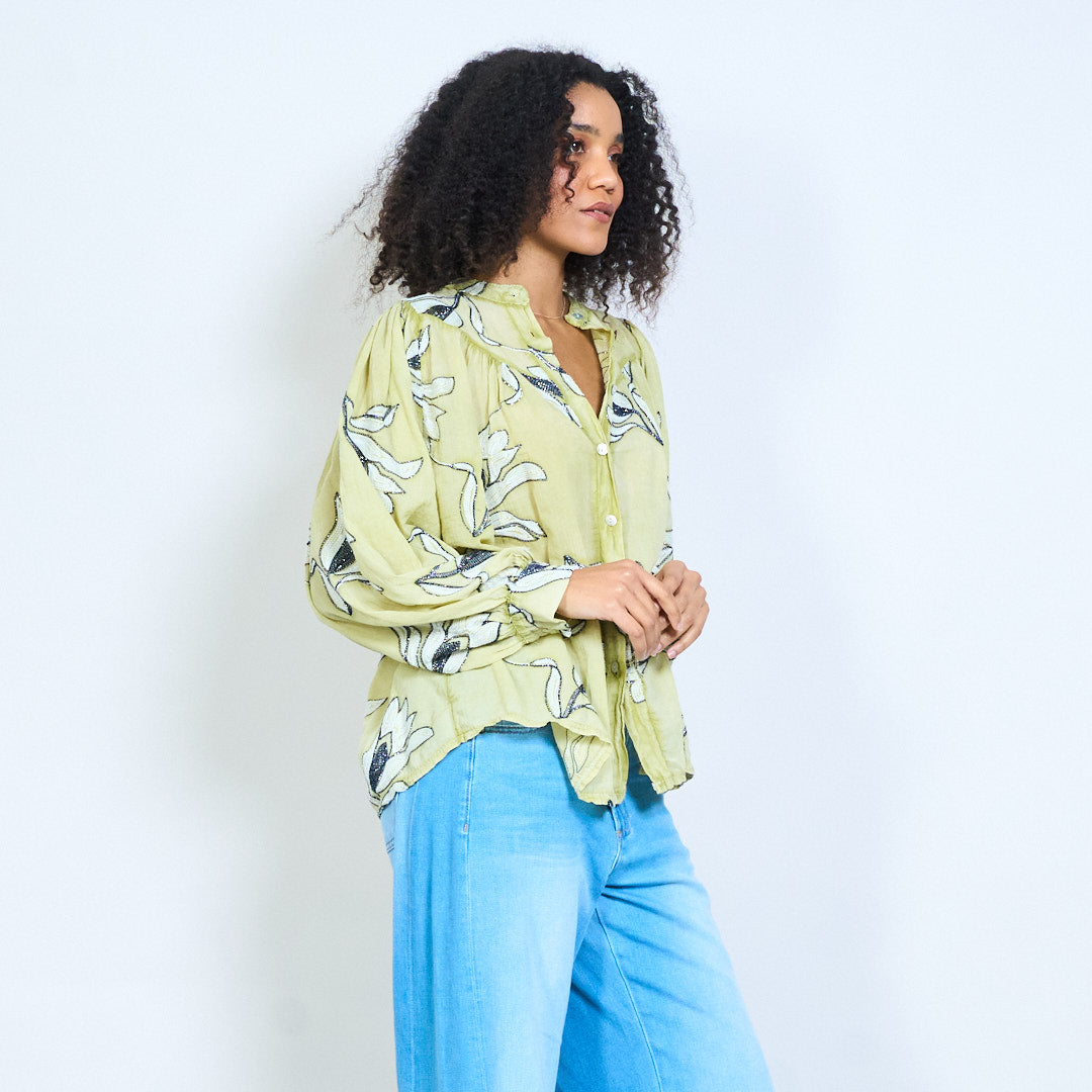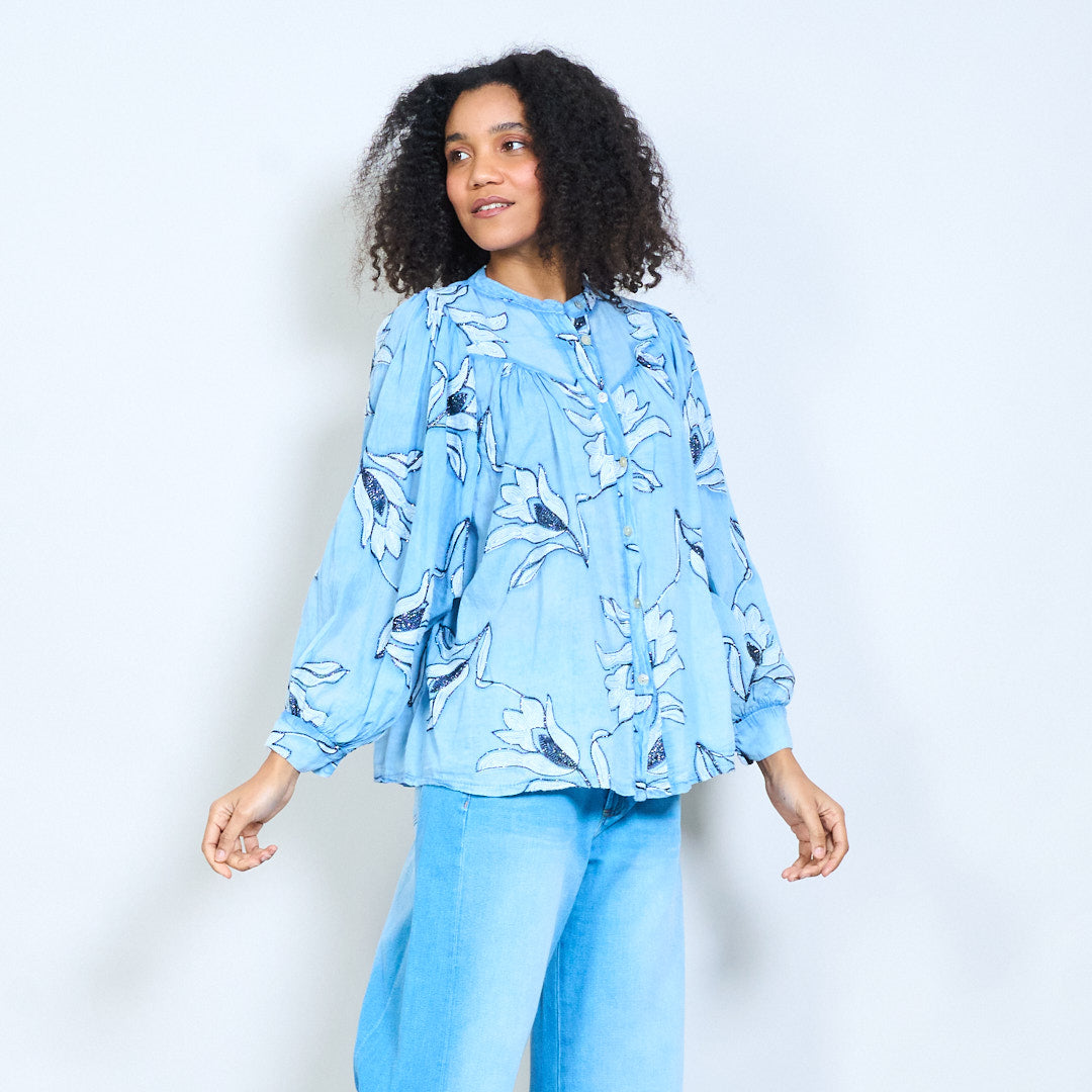 Groothandel in blouses met abstracte bloemenprint en verzamelde lange mouwen