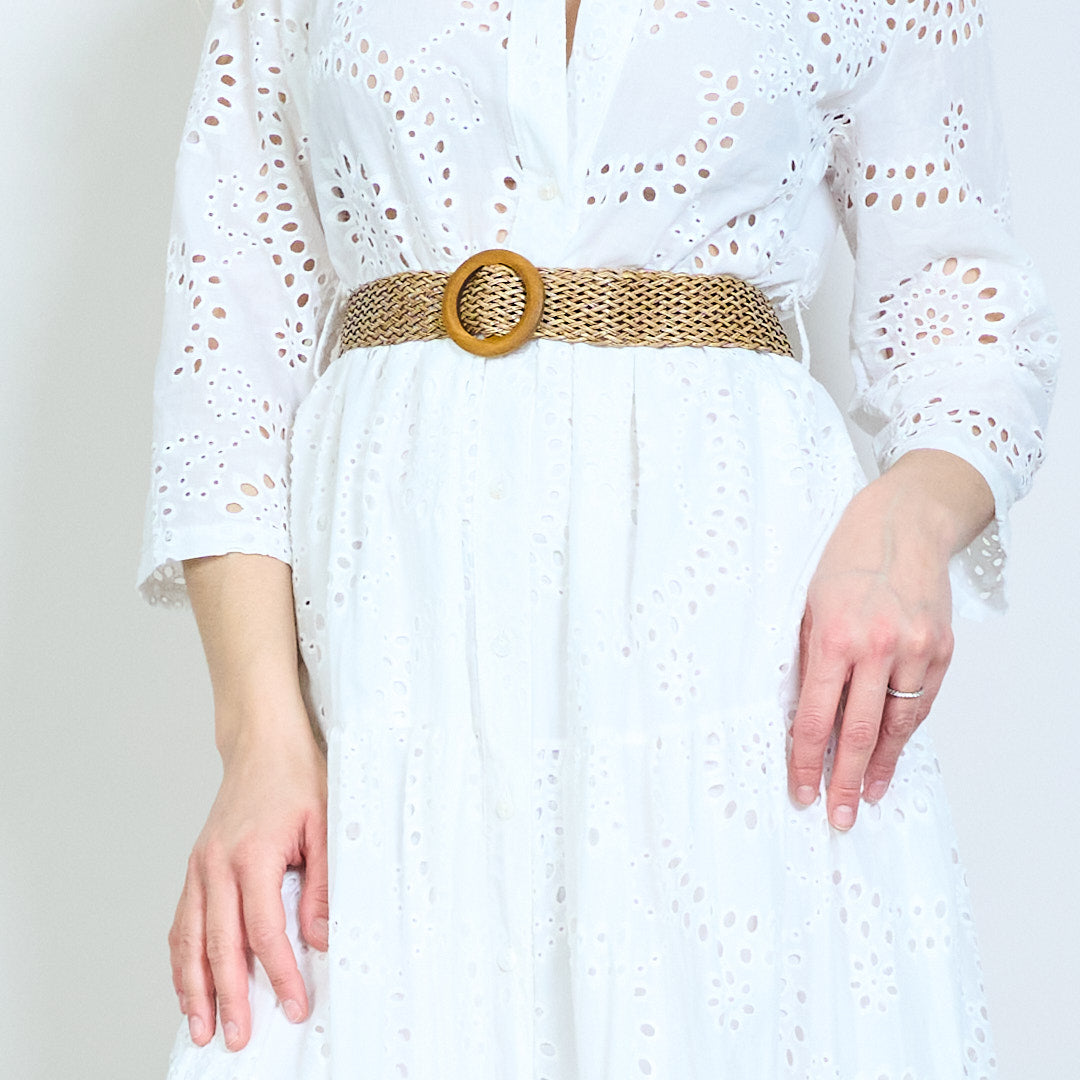 - Gedefinieerde taille versterkt met een gevlochten strikaccent