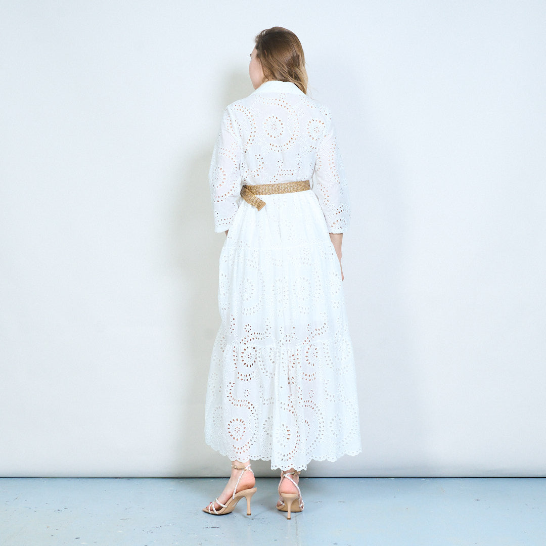 Midi-jurk met geborduurde bloemen, overhemdkraag, gelaagde zoom en gevlochten tailledetail