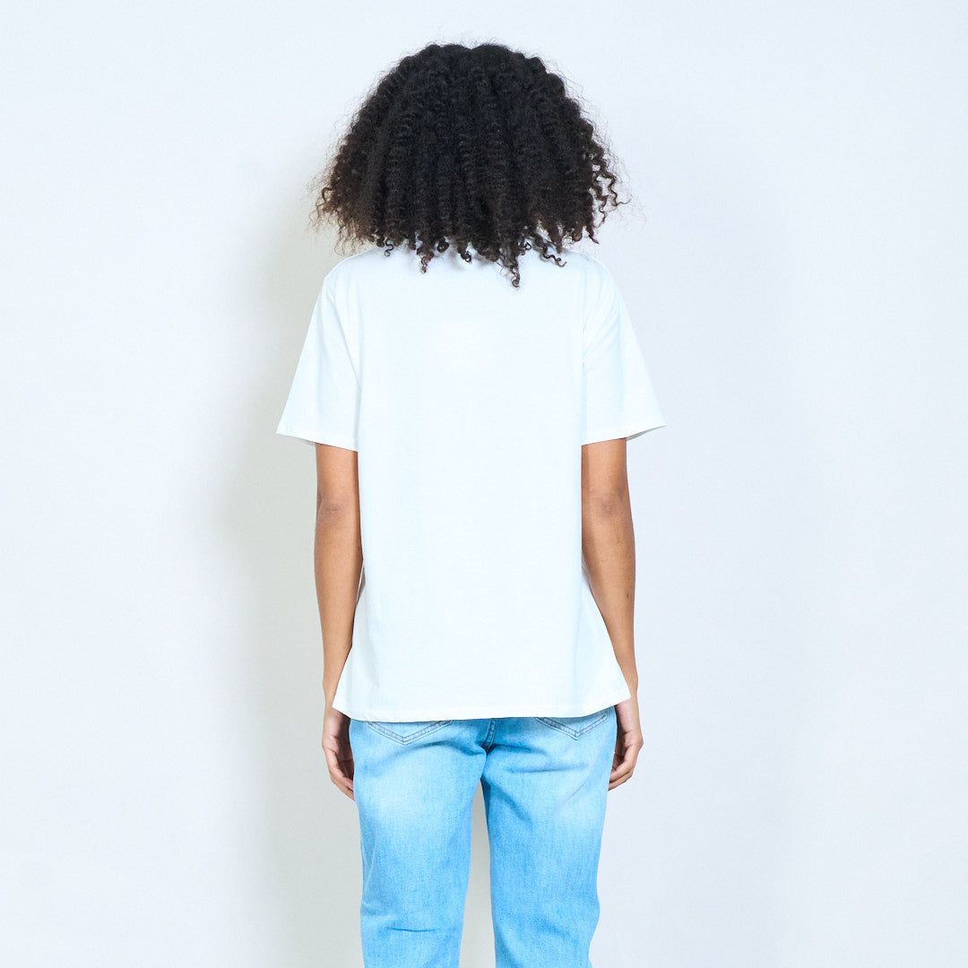 - Wit katoenen T-shirt met gele getextureerde chenille "Dolce vita" slogan