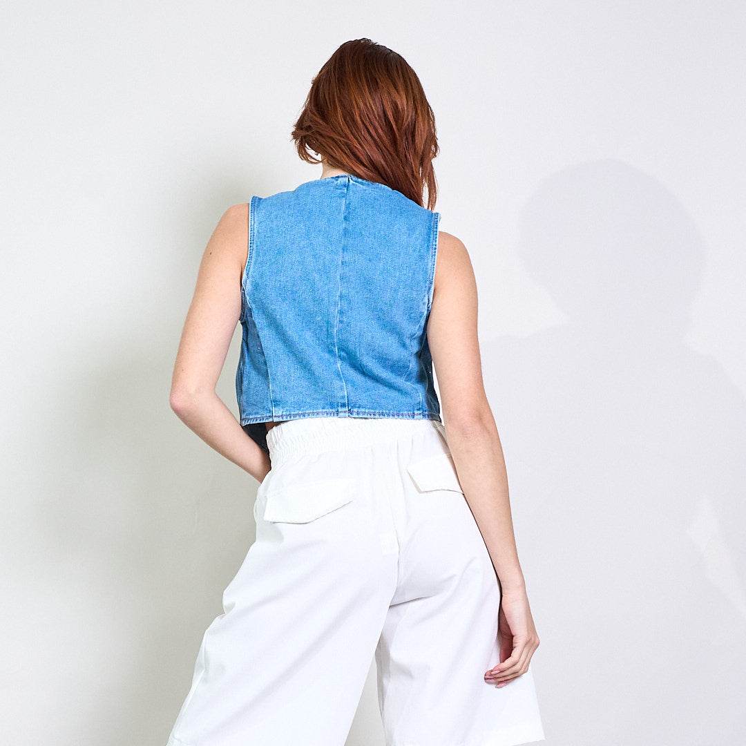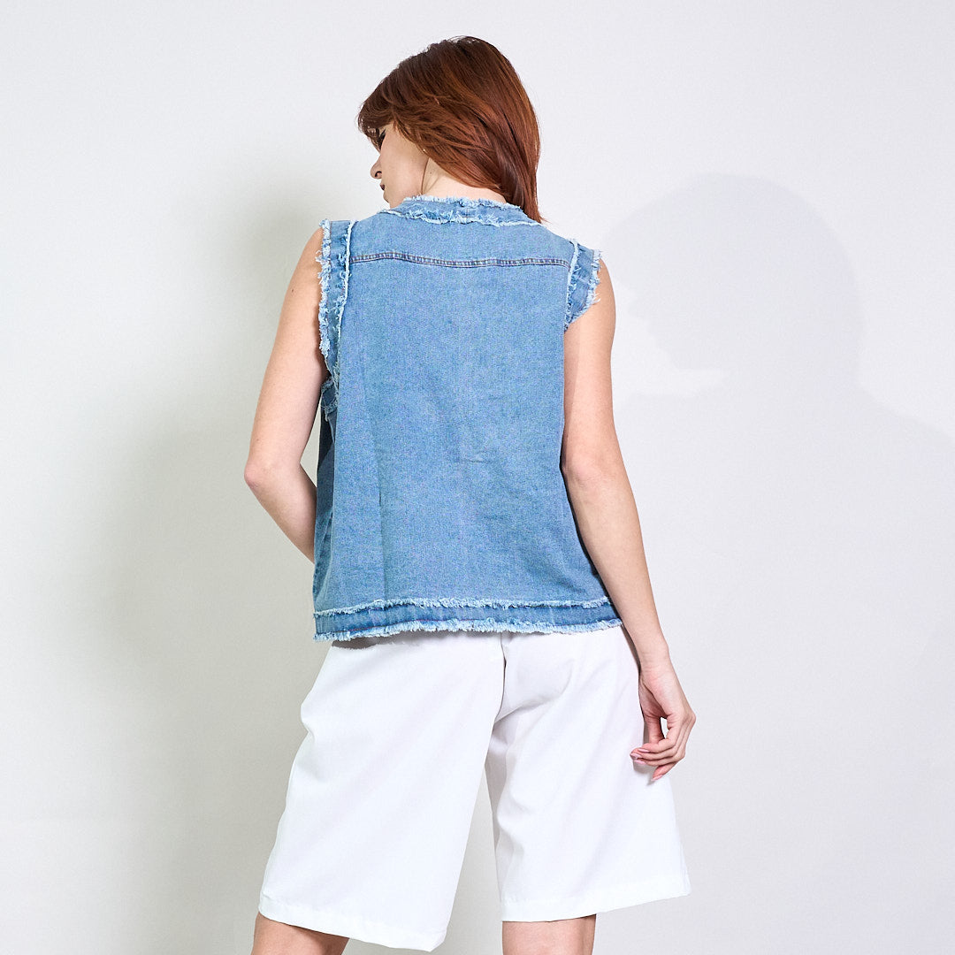 Raw Fringe Trim multi-pocket mouwloze denimvest groothandel