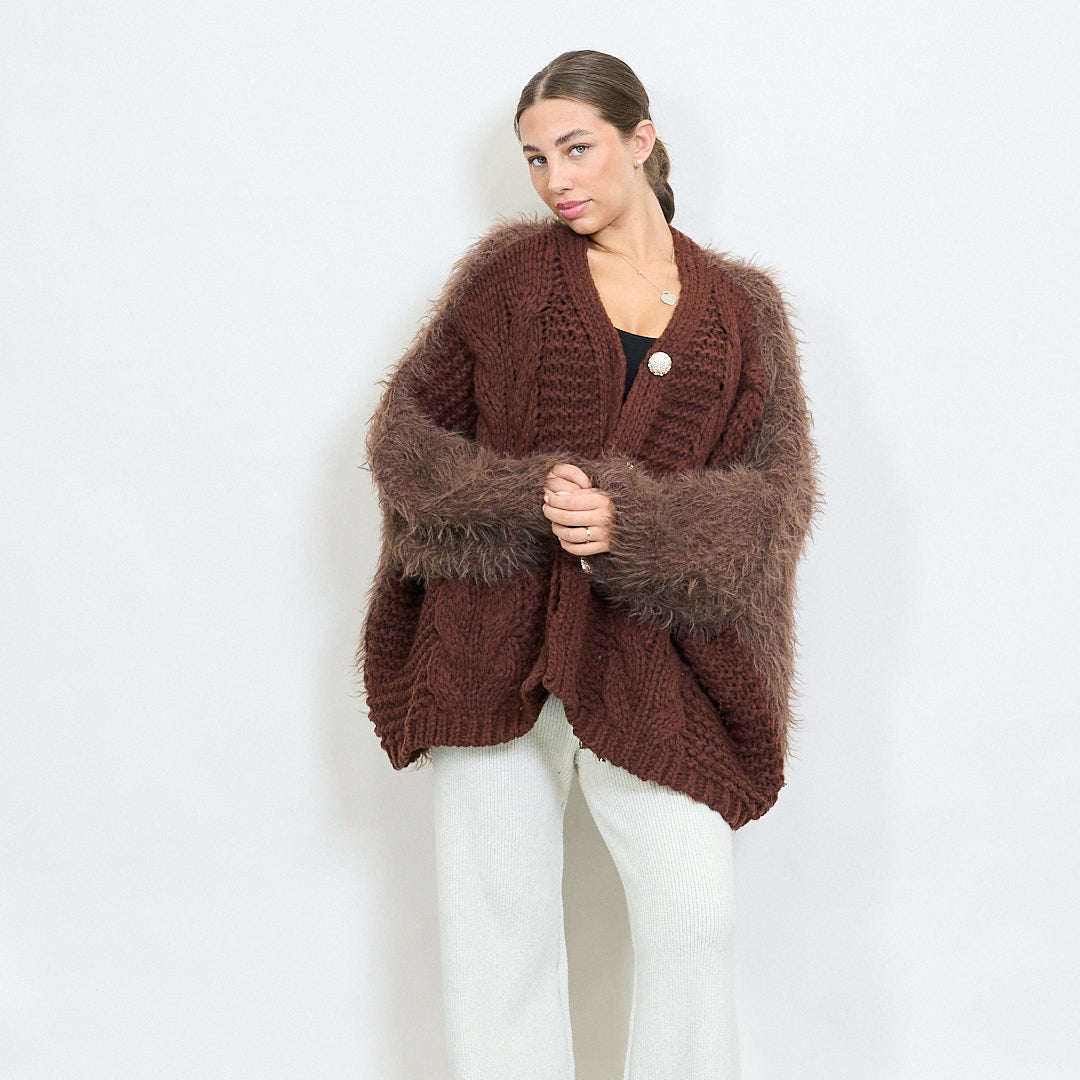 - Zacht fuzzy garen langs mouwen en randen voor extra flair
