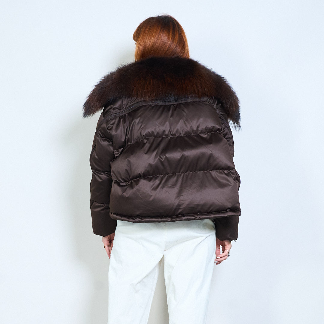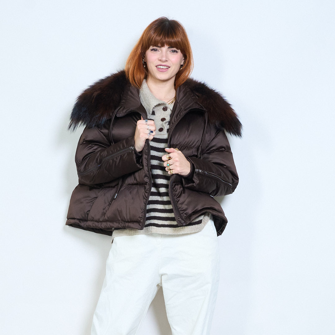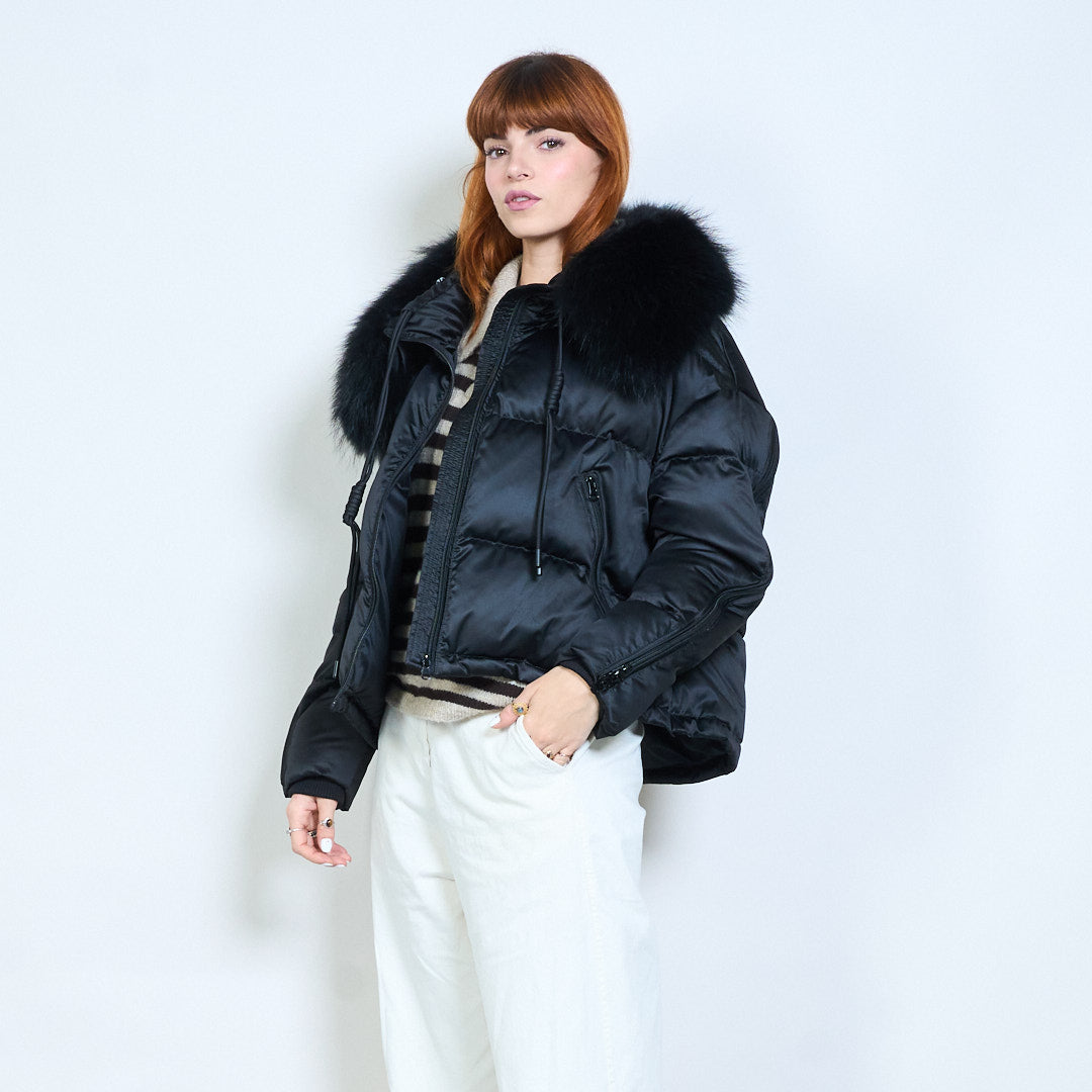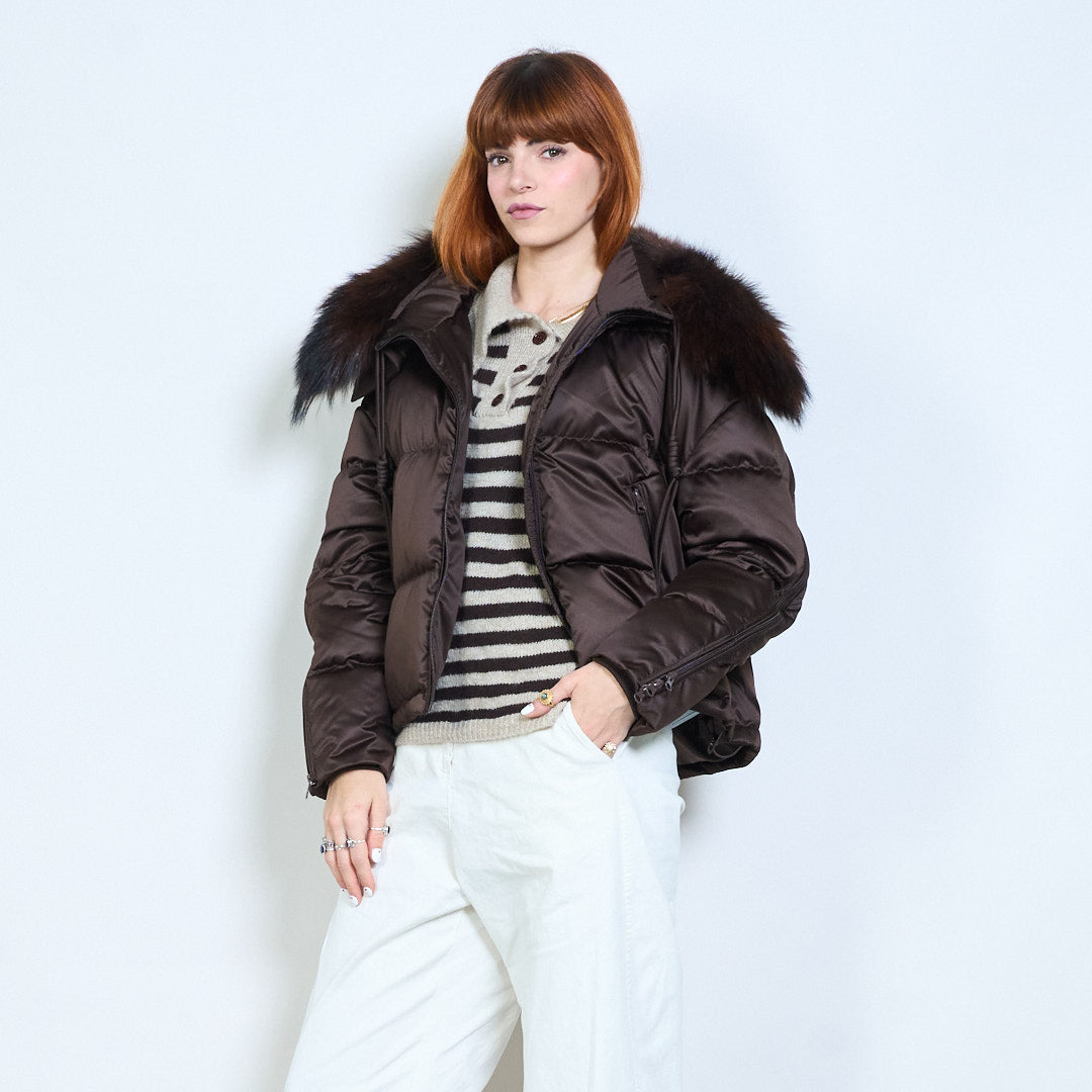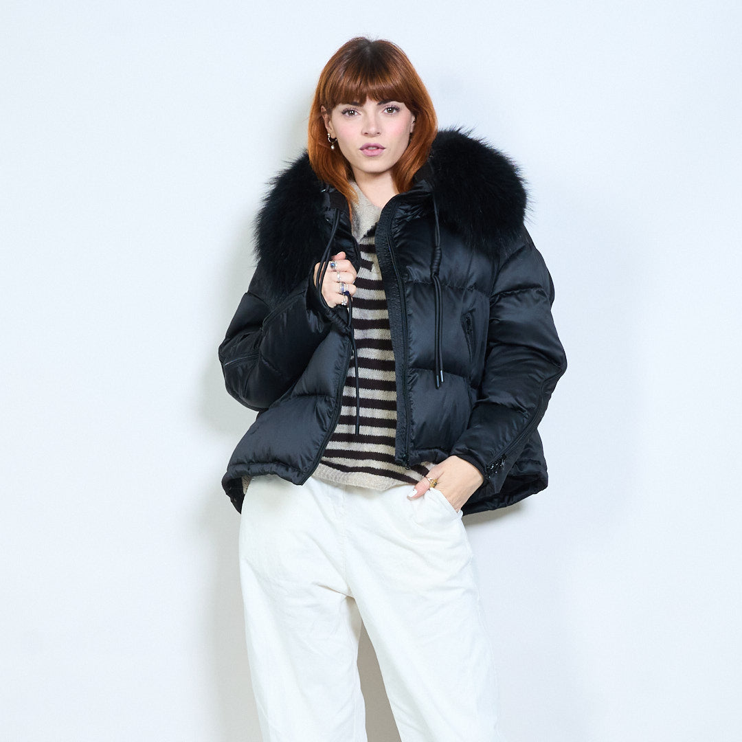 Cropped gewatteerd eendendonsjack met capuchon, rits aan de voorkant en pluche kraag, groothandel