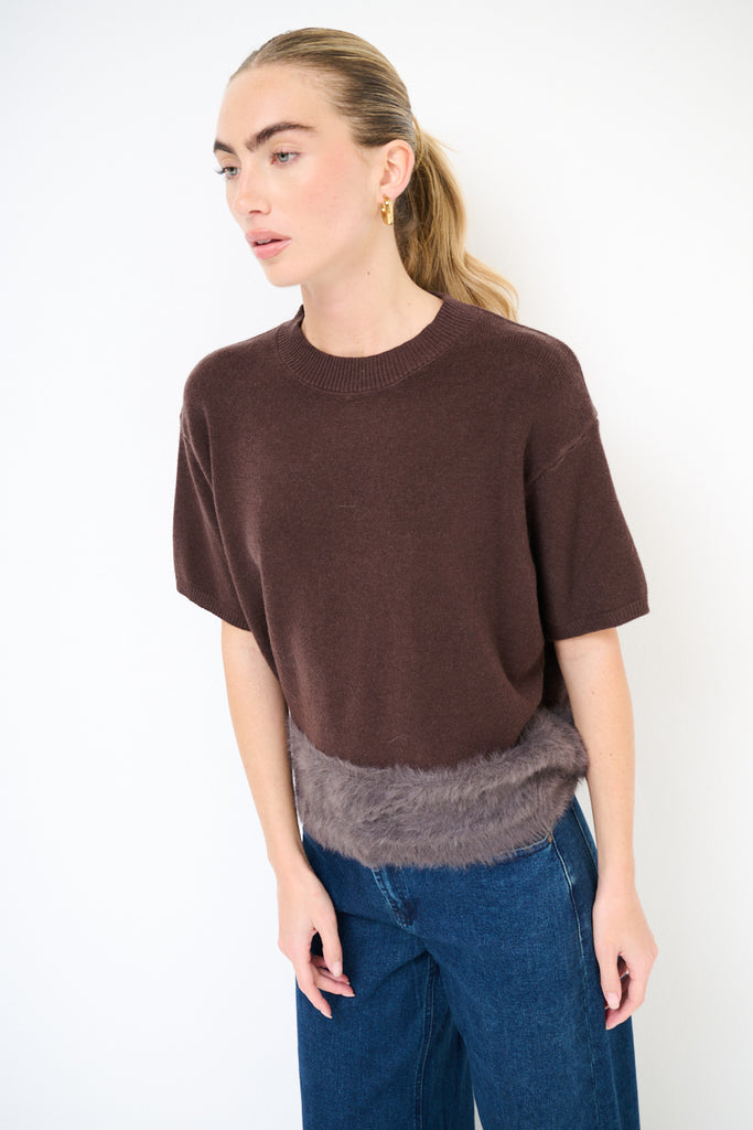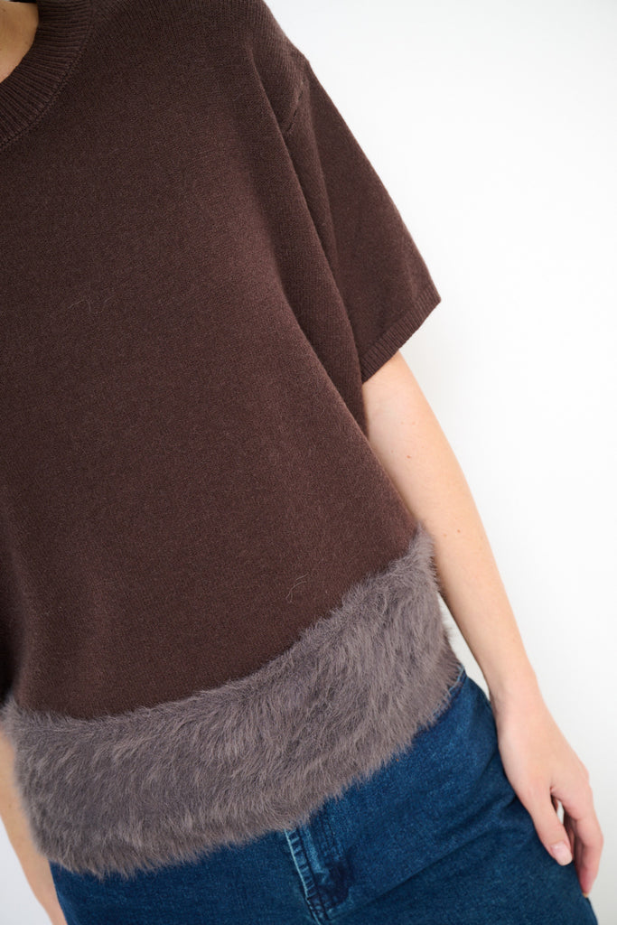 Gebreide top met korte mouwen en zoom van imitatiebont in de groothandel