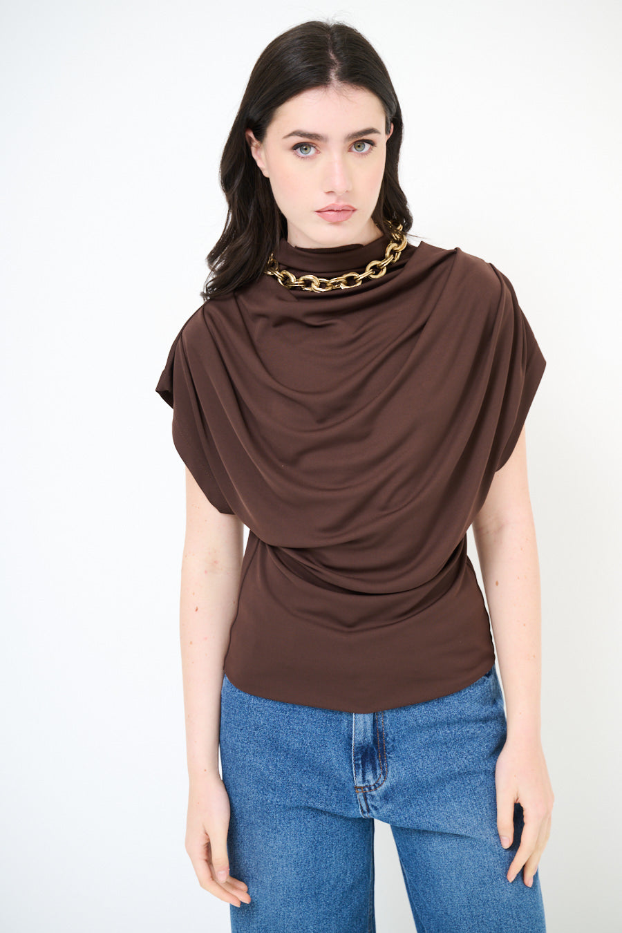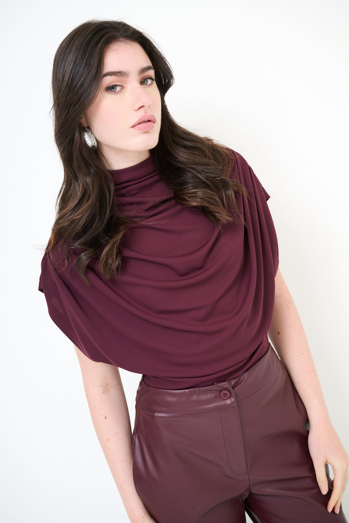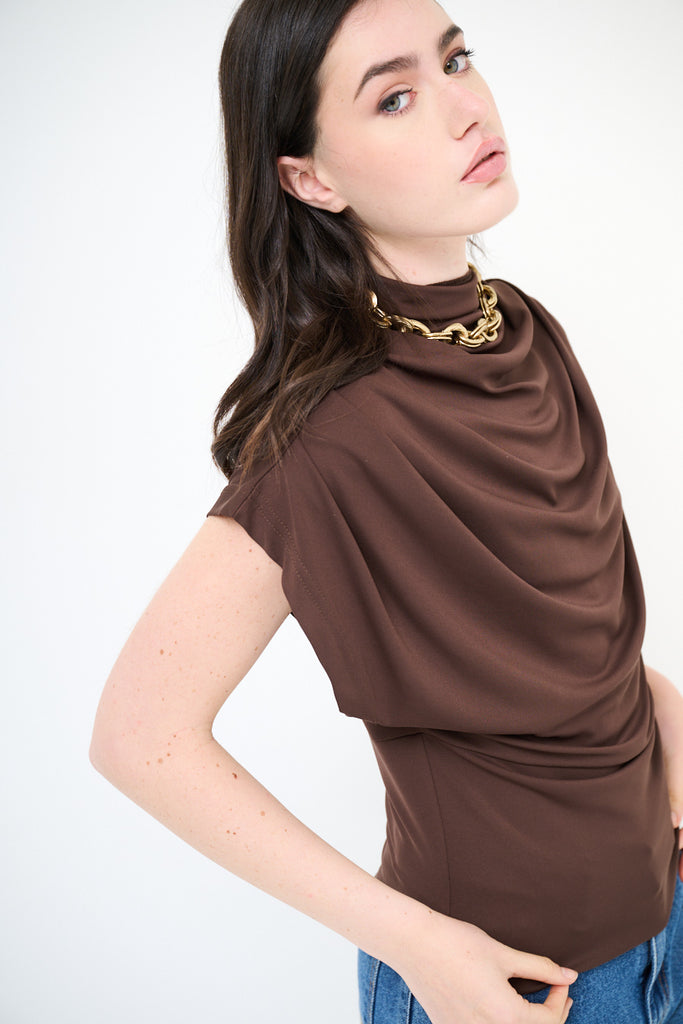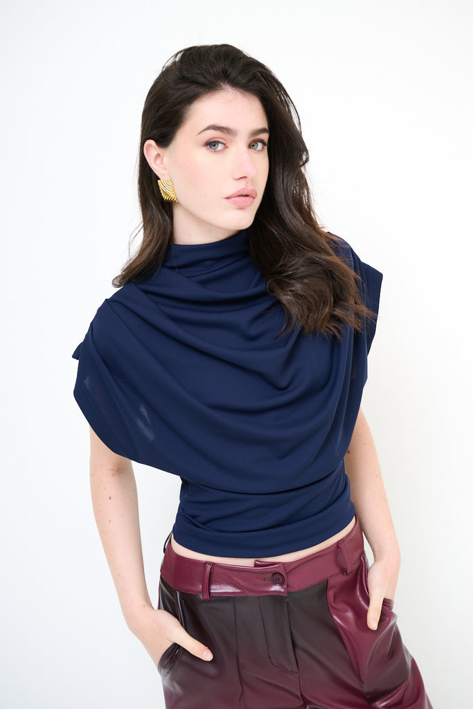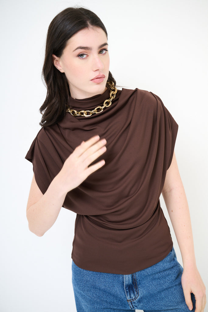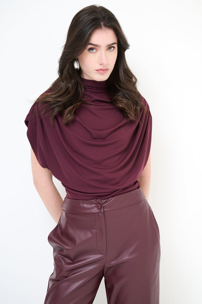 Gedrapeerde mouwloze top met hoge hals en zachte vouwdetails groothandel