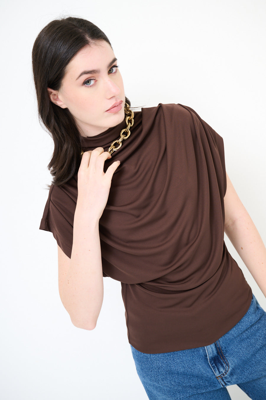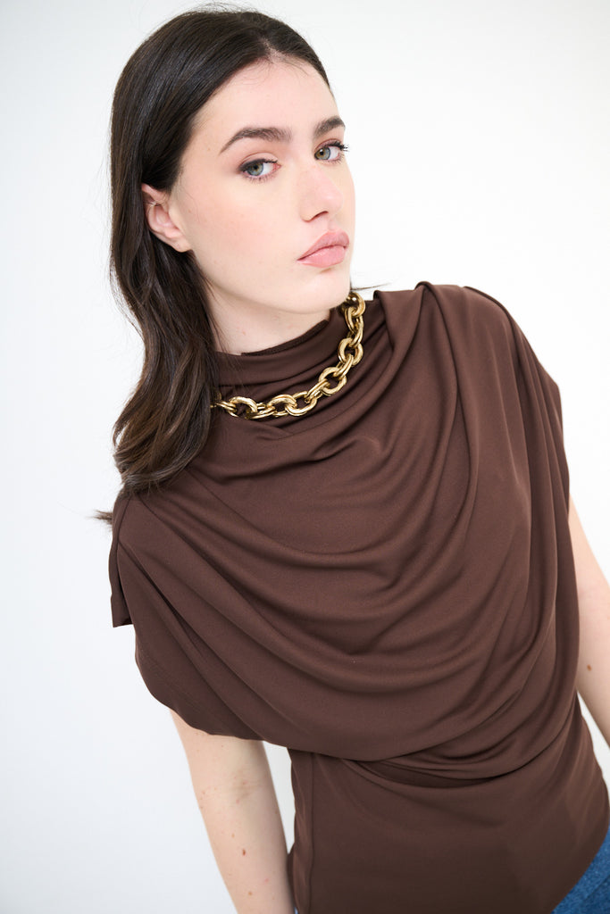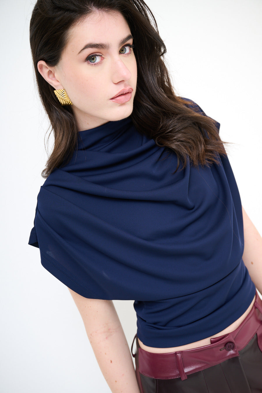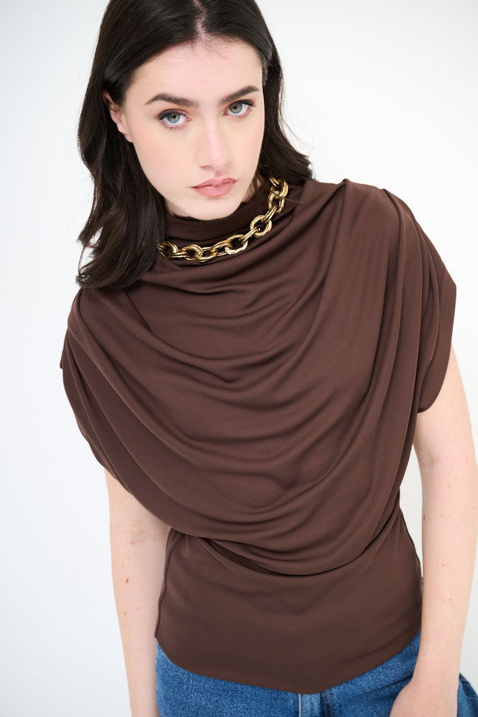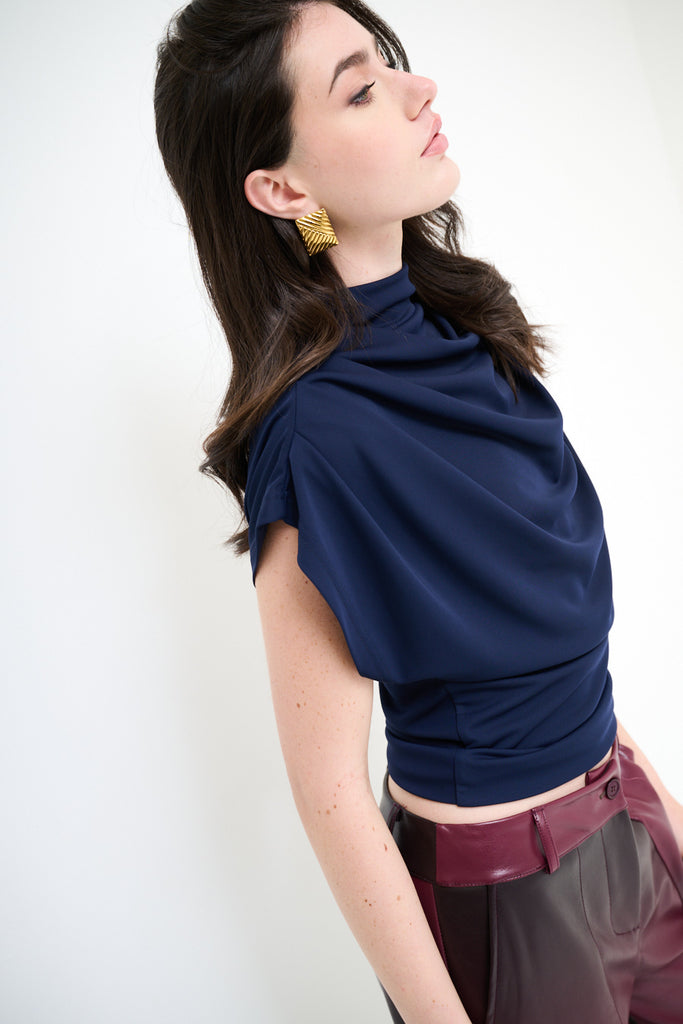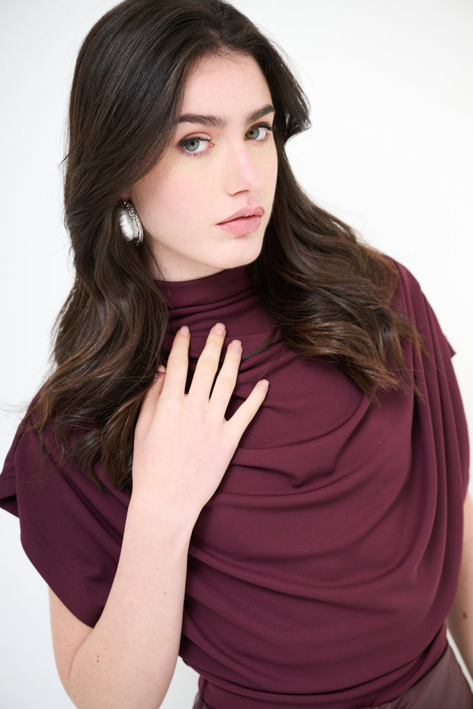 Gedrapeerde mouwloze top met hoge hals en zachte vouwdetails groothandel