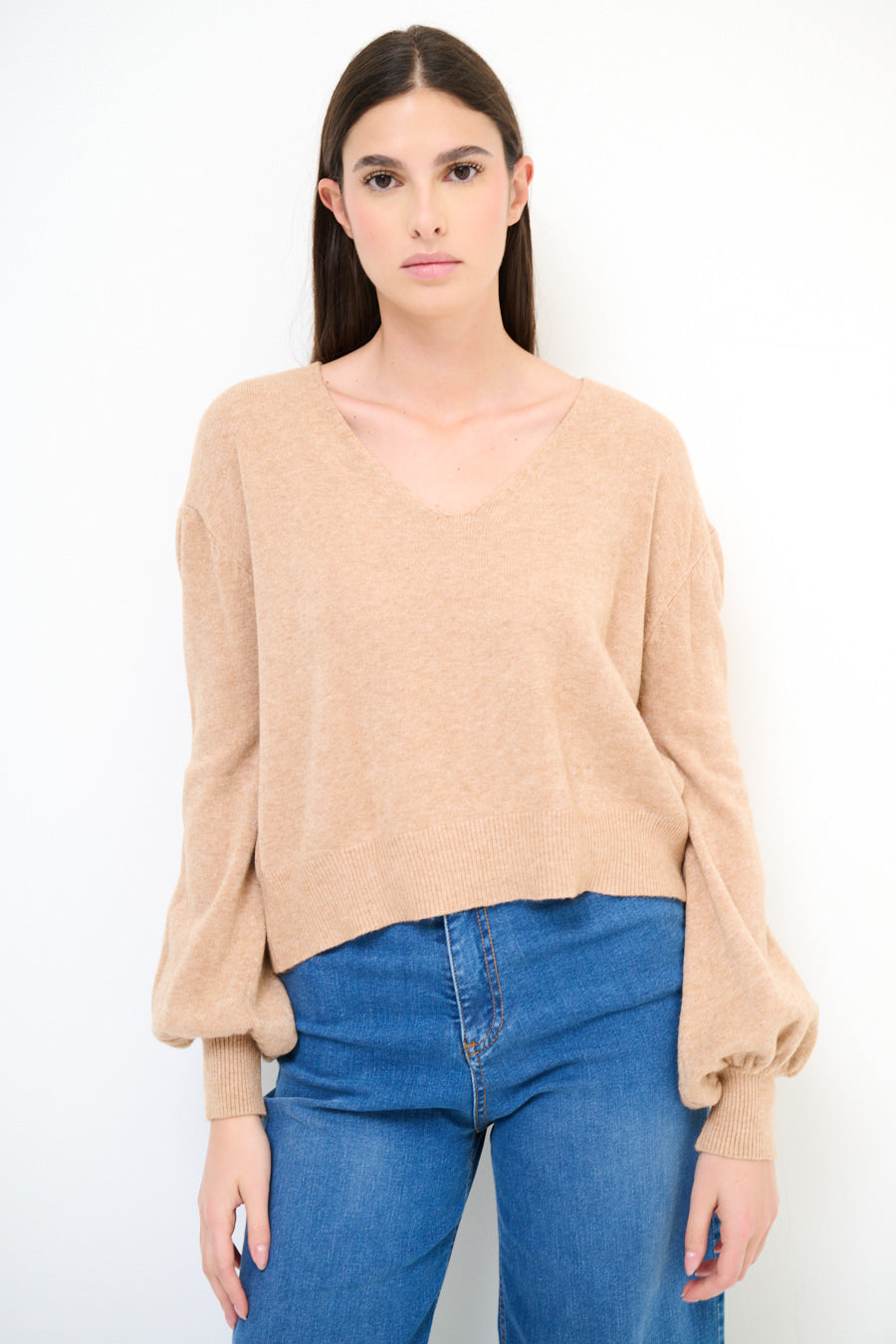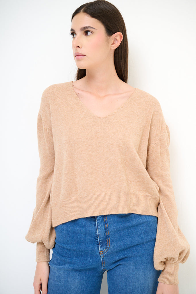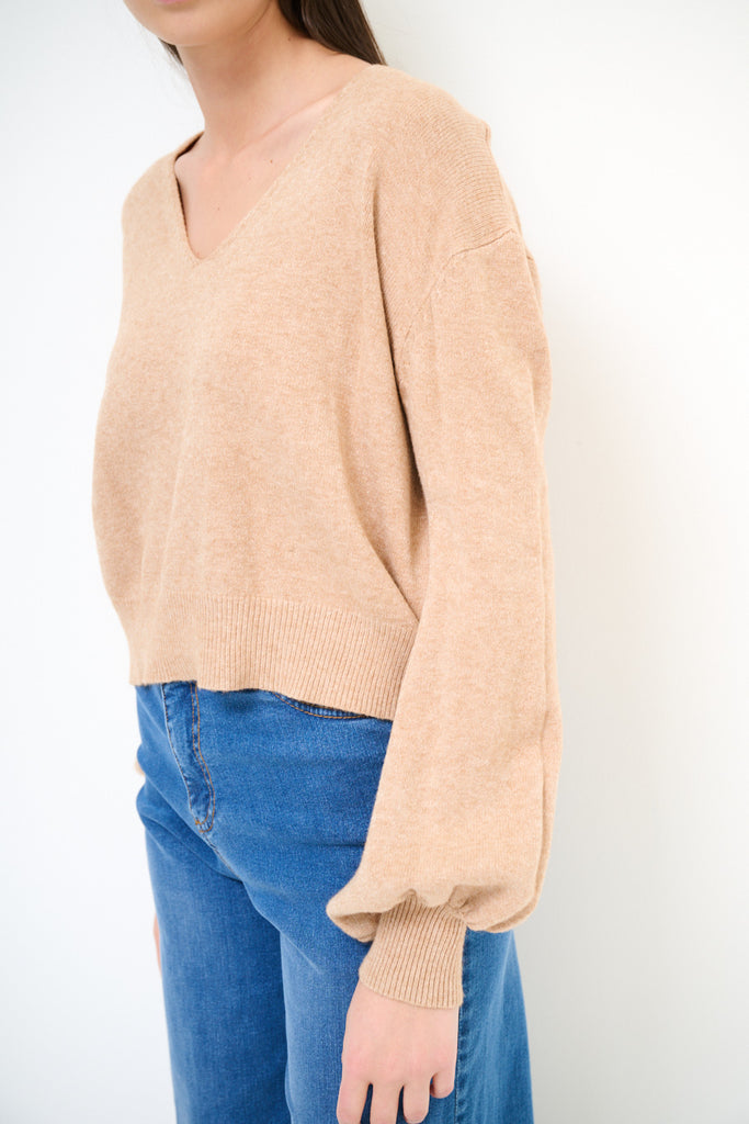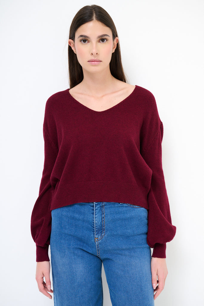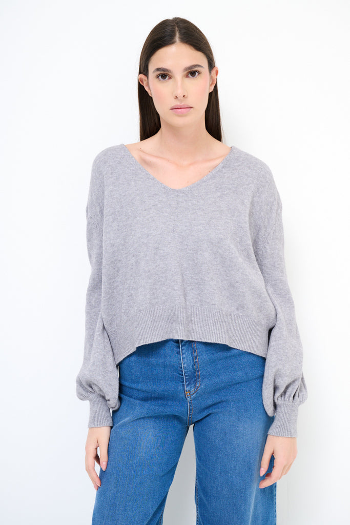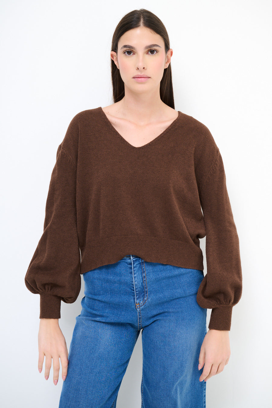 Groothandel in ontspannen gebreide trui met V-hals en ballonmouwen