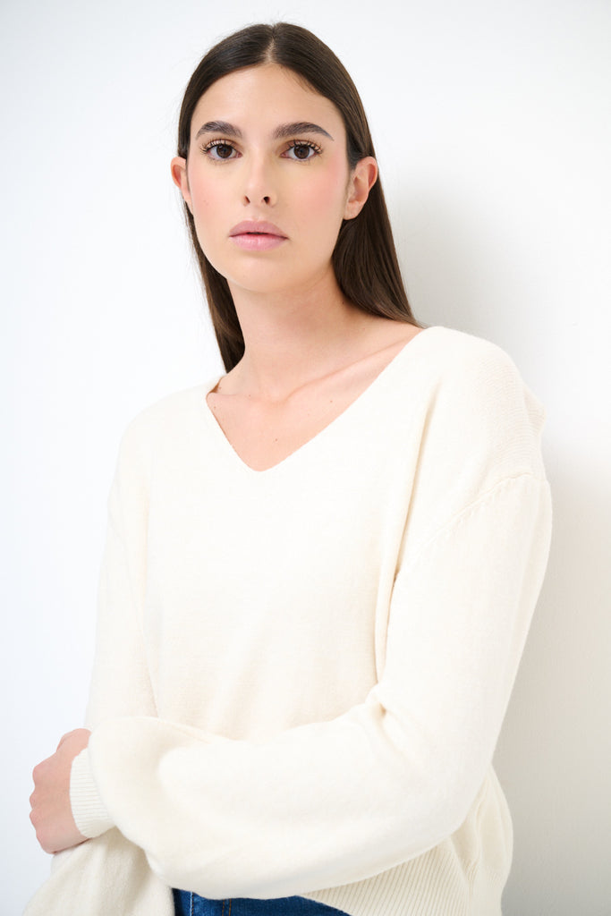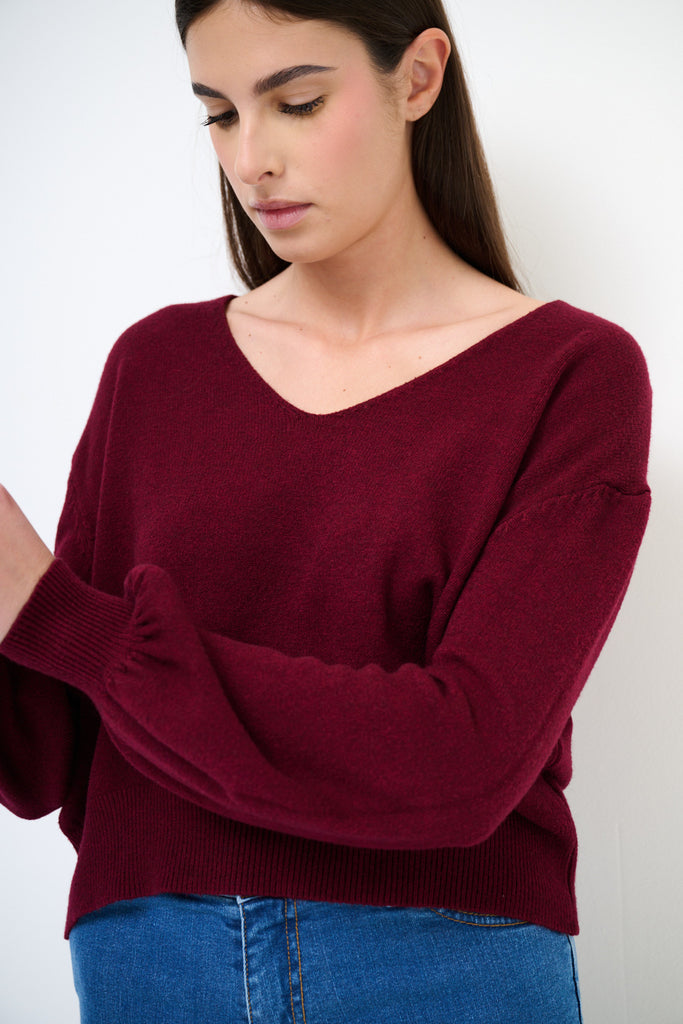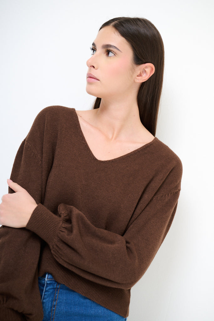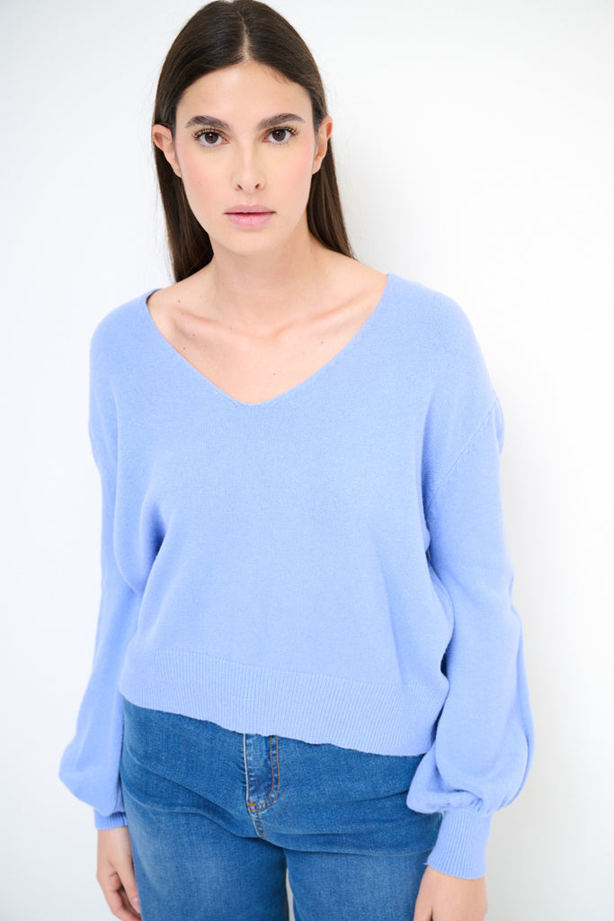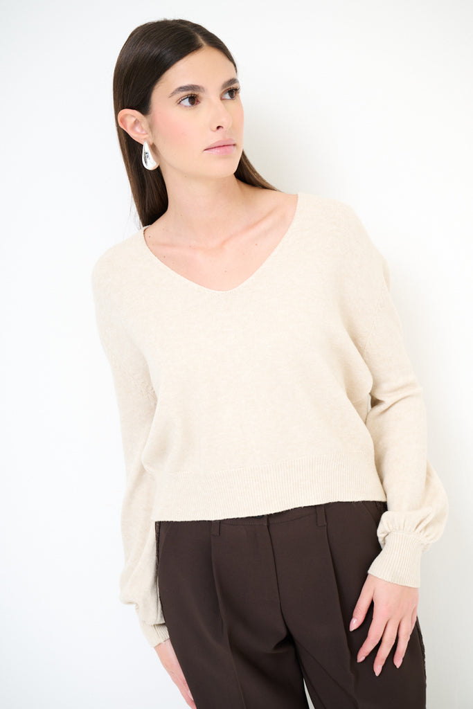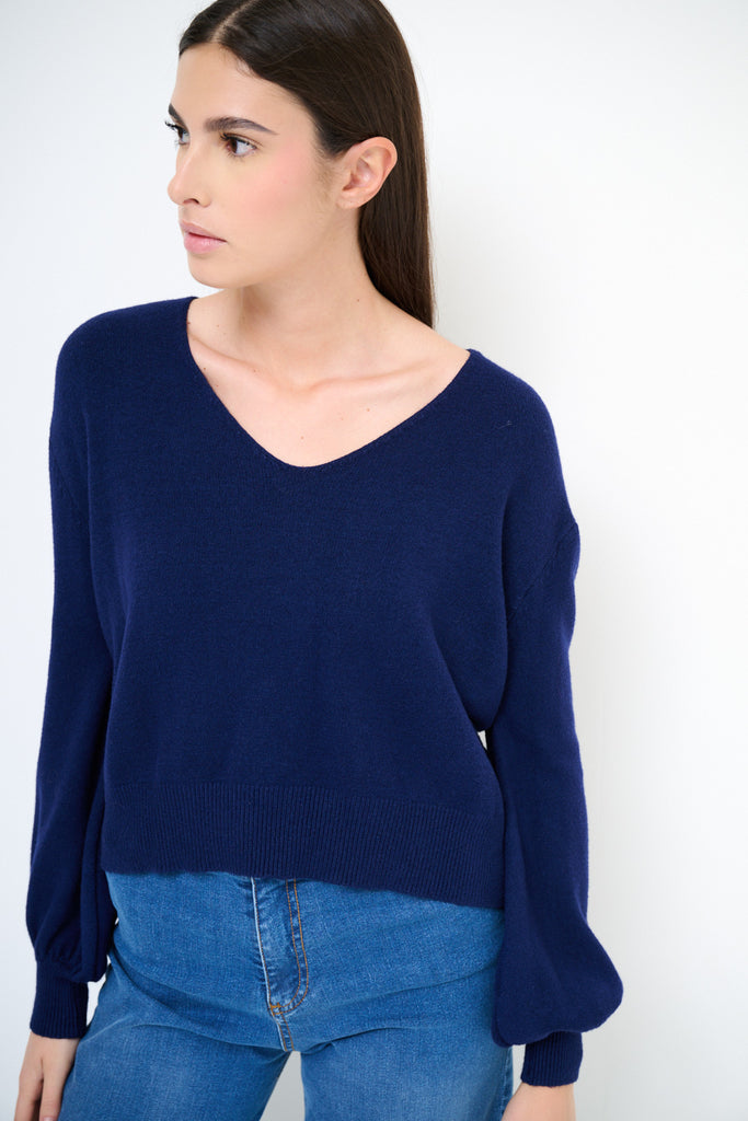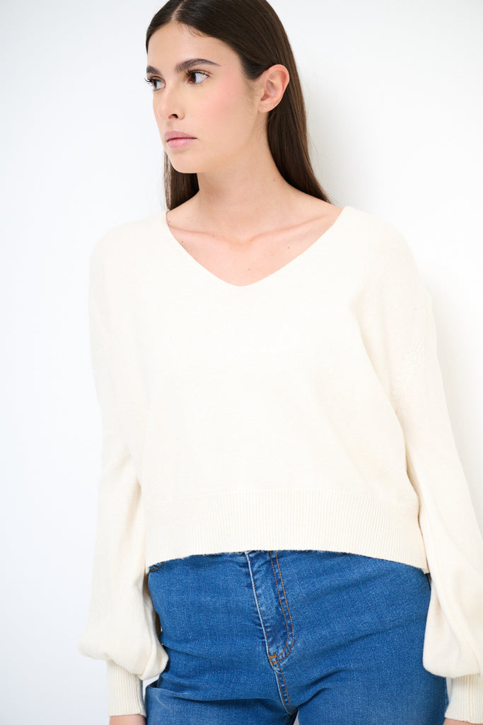 Groothandel in ontspannen gebreide trui met V-hals en ballonmouwen