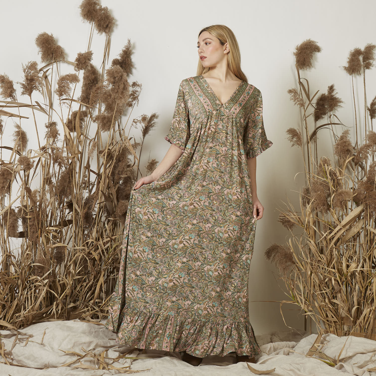 Groothandel Lange print Large V-Neck Silk Dress met gegolfde zoom