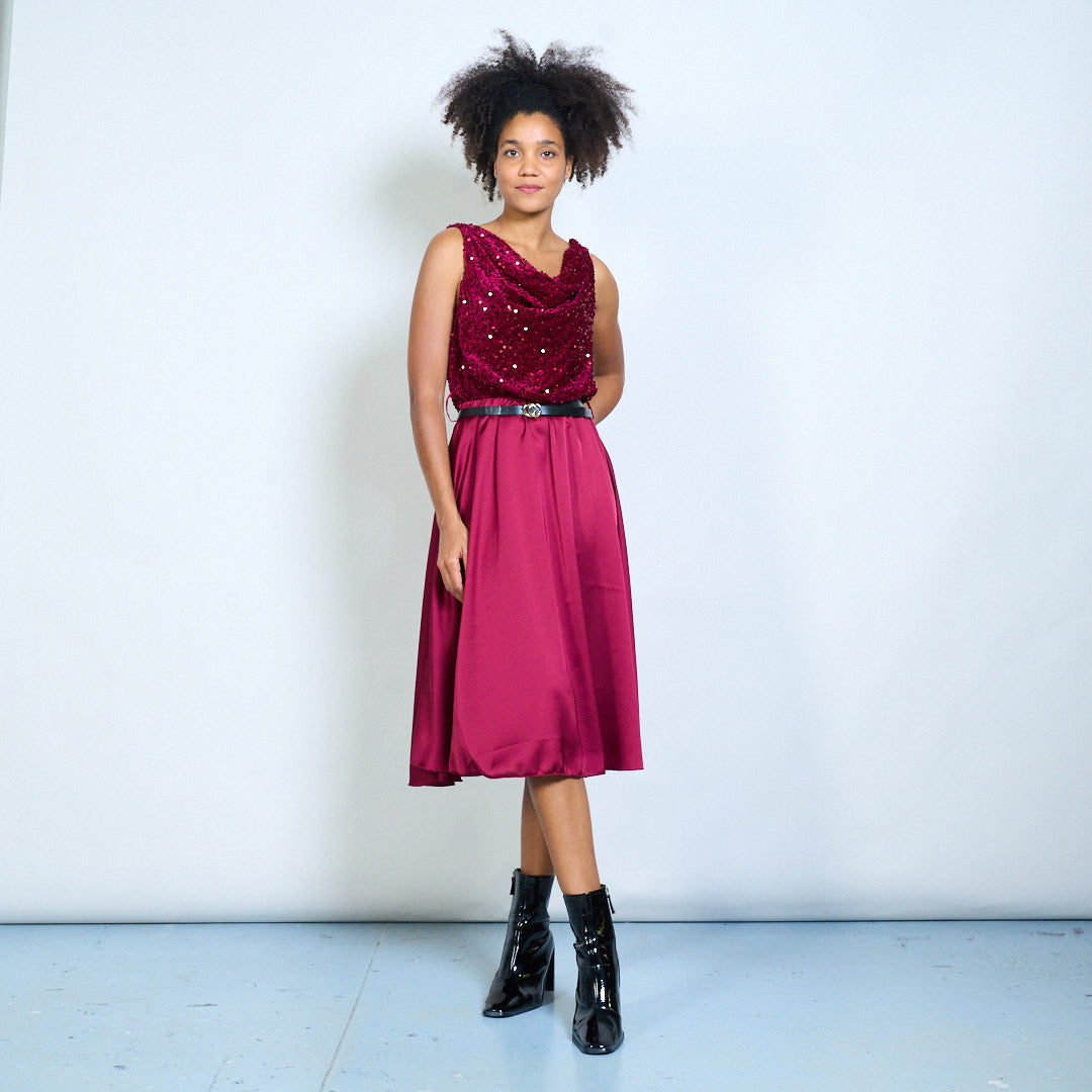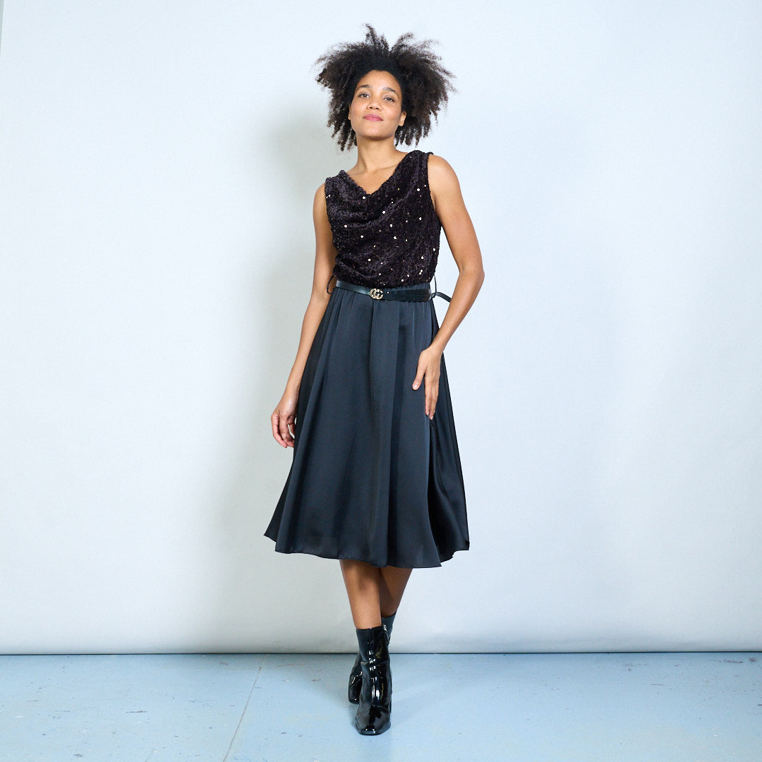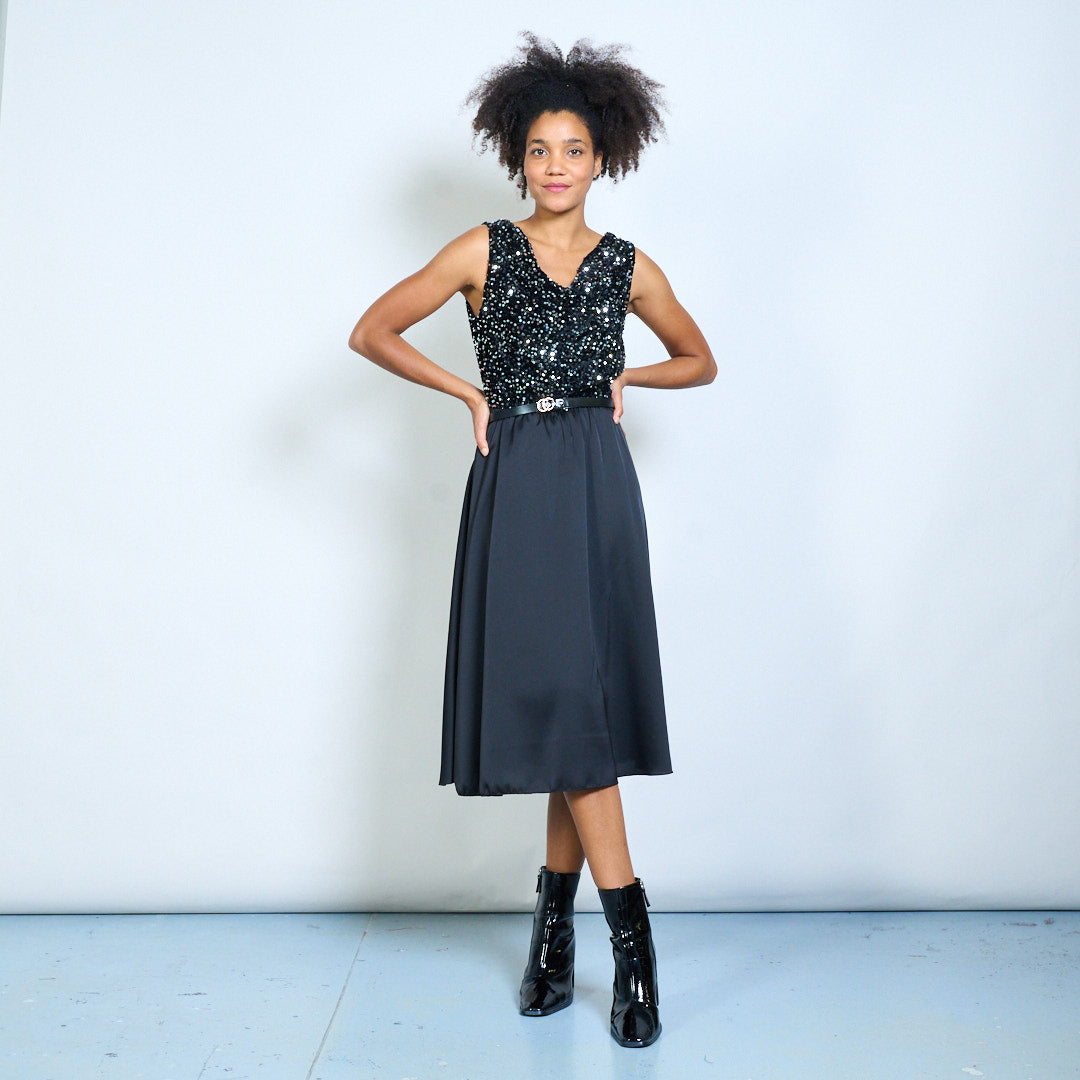 Groothandel midi-jurk met gedrapeerd lijfje, ceintuur en pailletten