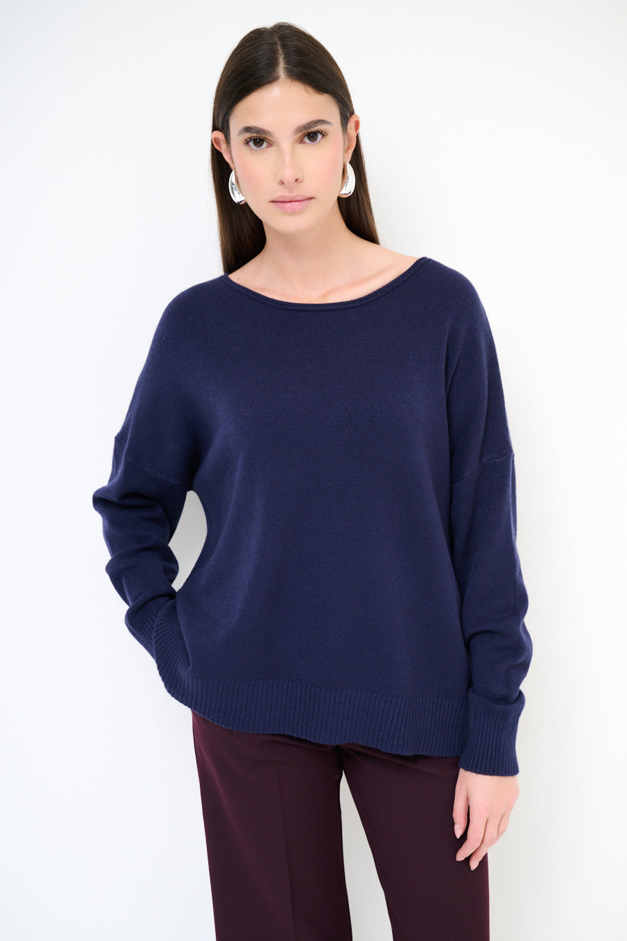 Klassieke marineblauwe gebreide trui met ronde hals, groothandel