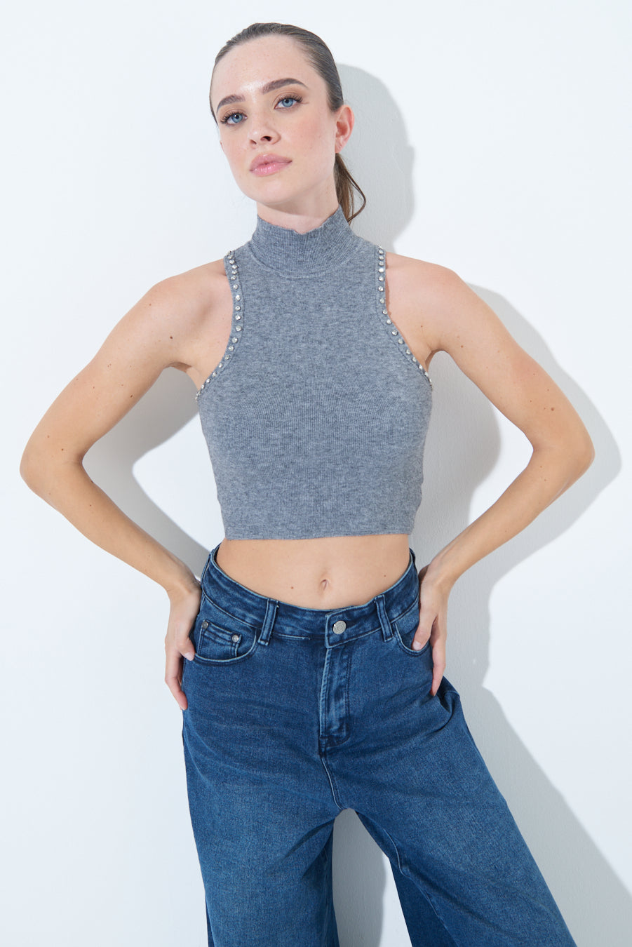 Mouwloze gebreide top met hoge hals en studs groothandel