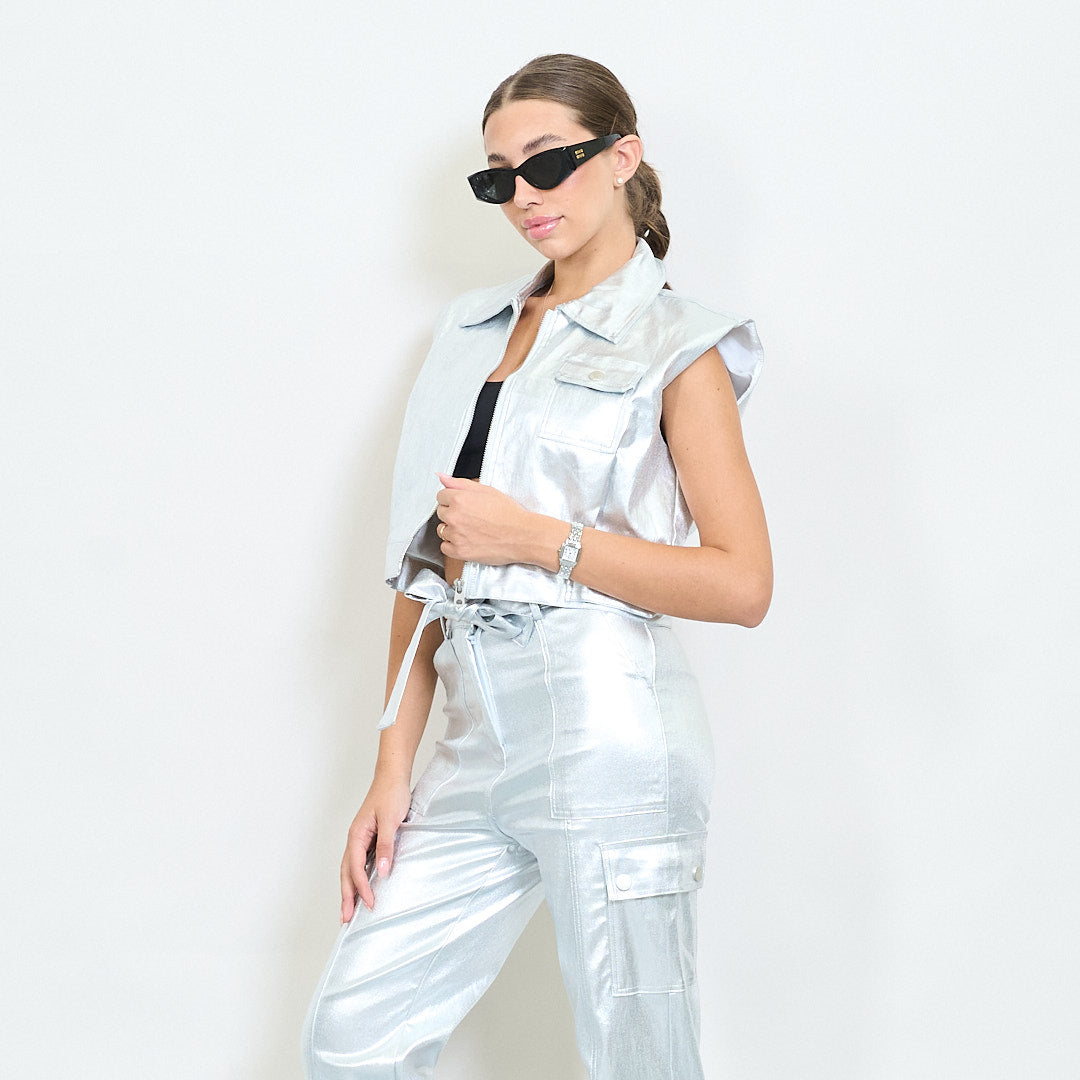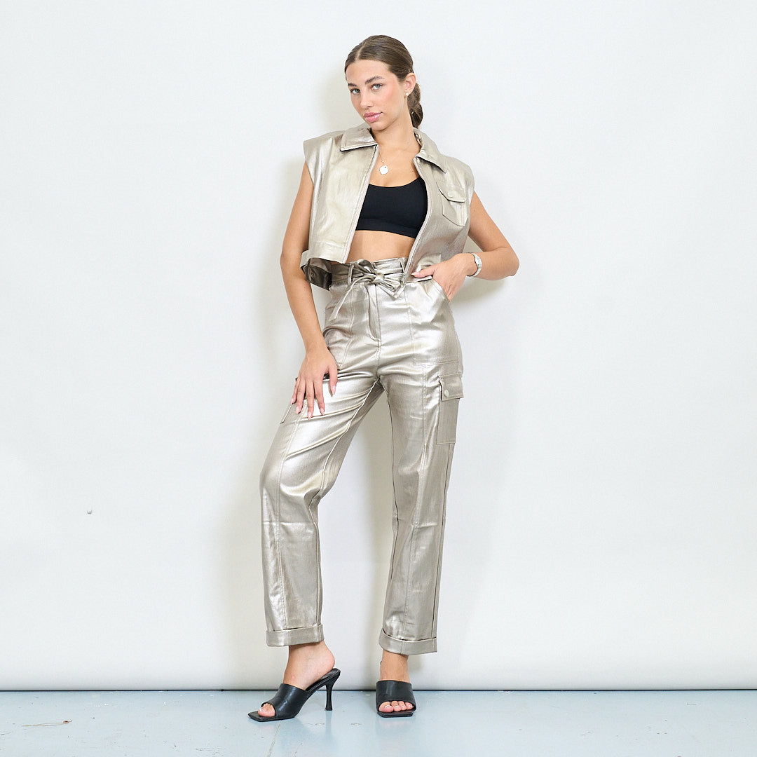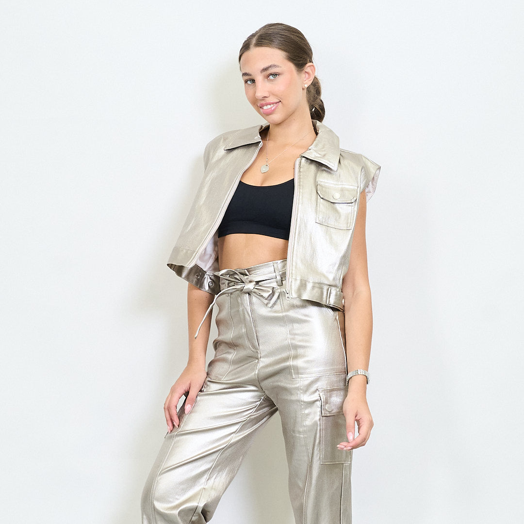 Metallic faux lederen mouwloos zipvest met zakdetailgroothandel