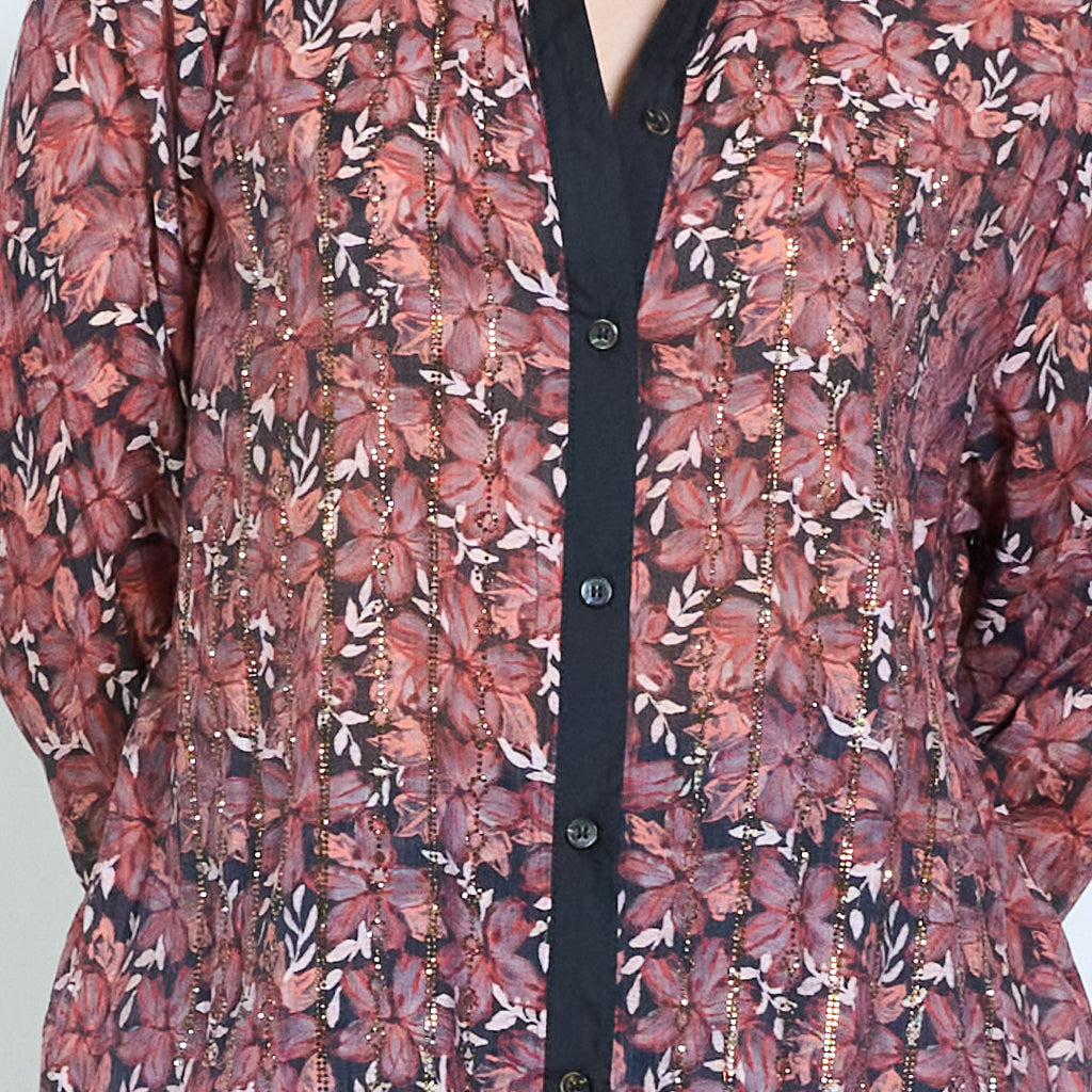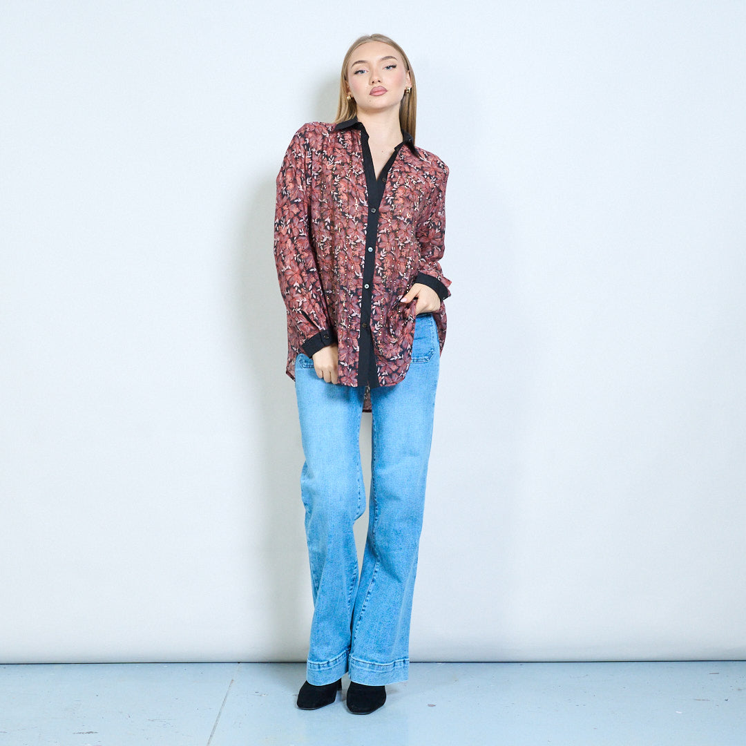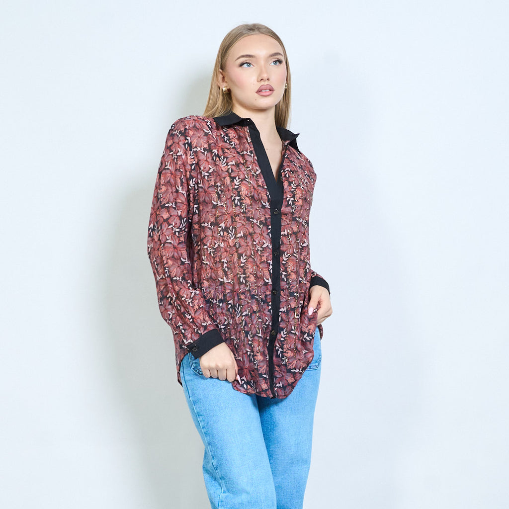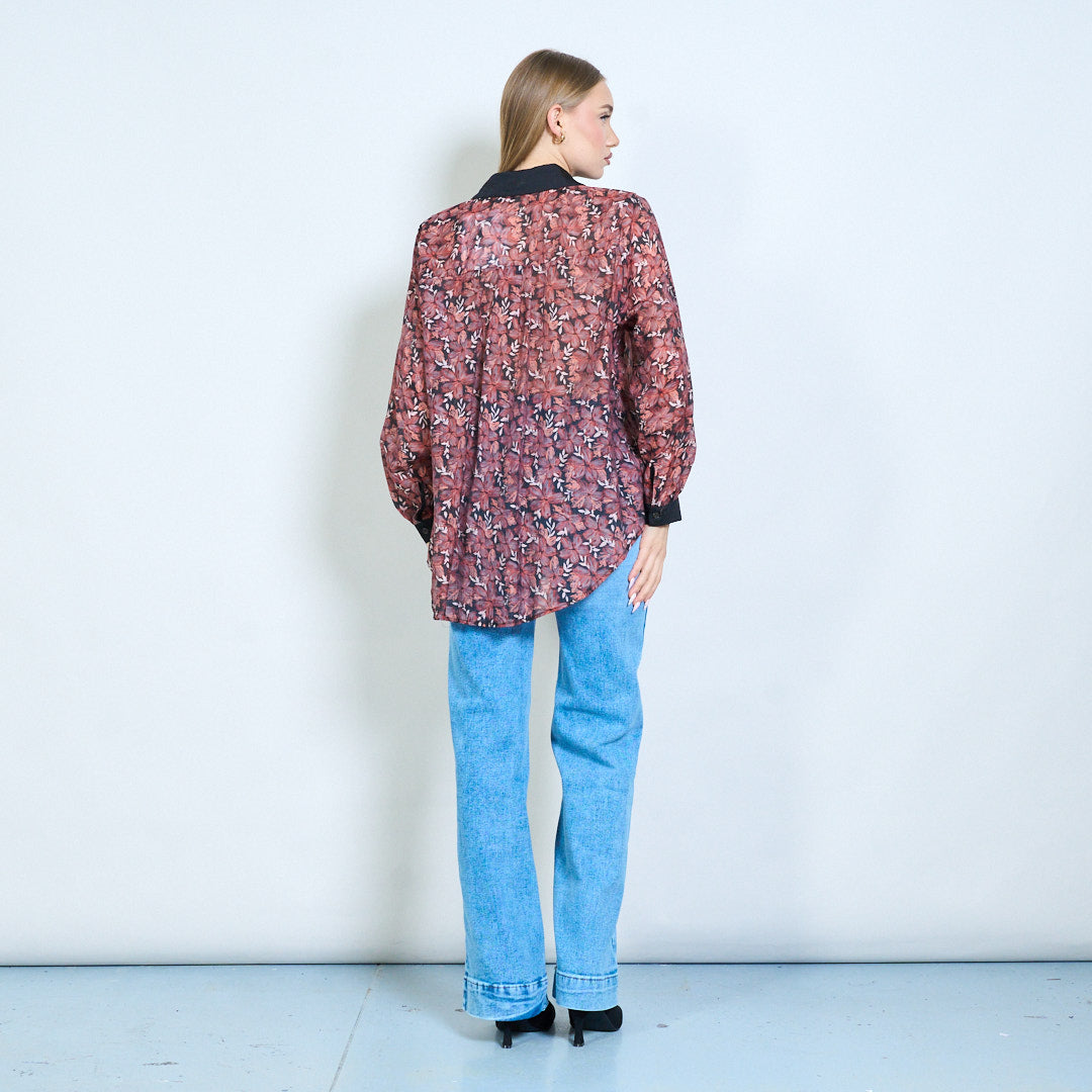 Blouse met gelaagde bloemblaadjes, grafische contrasterende rand en knoopsluiting aan de voorkant, groothandel