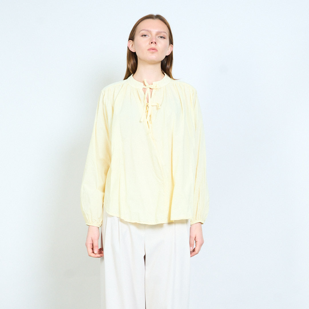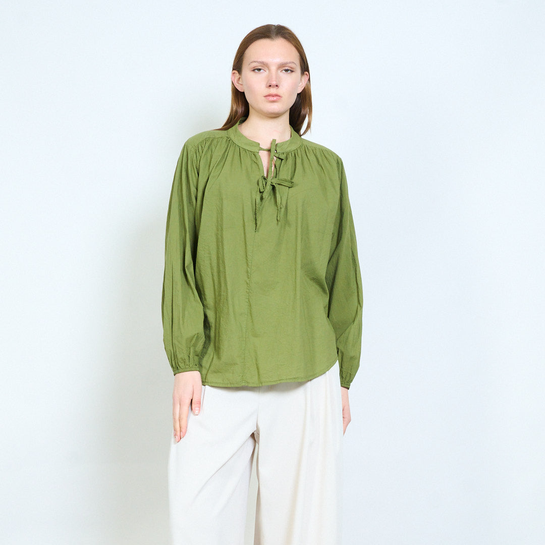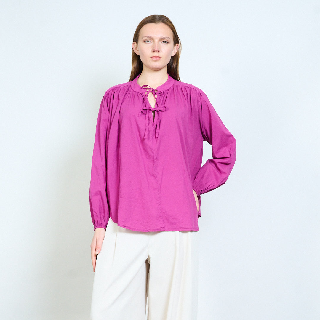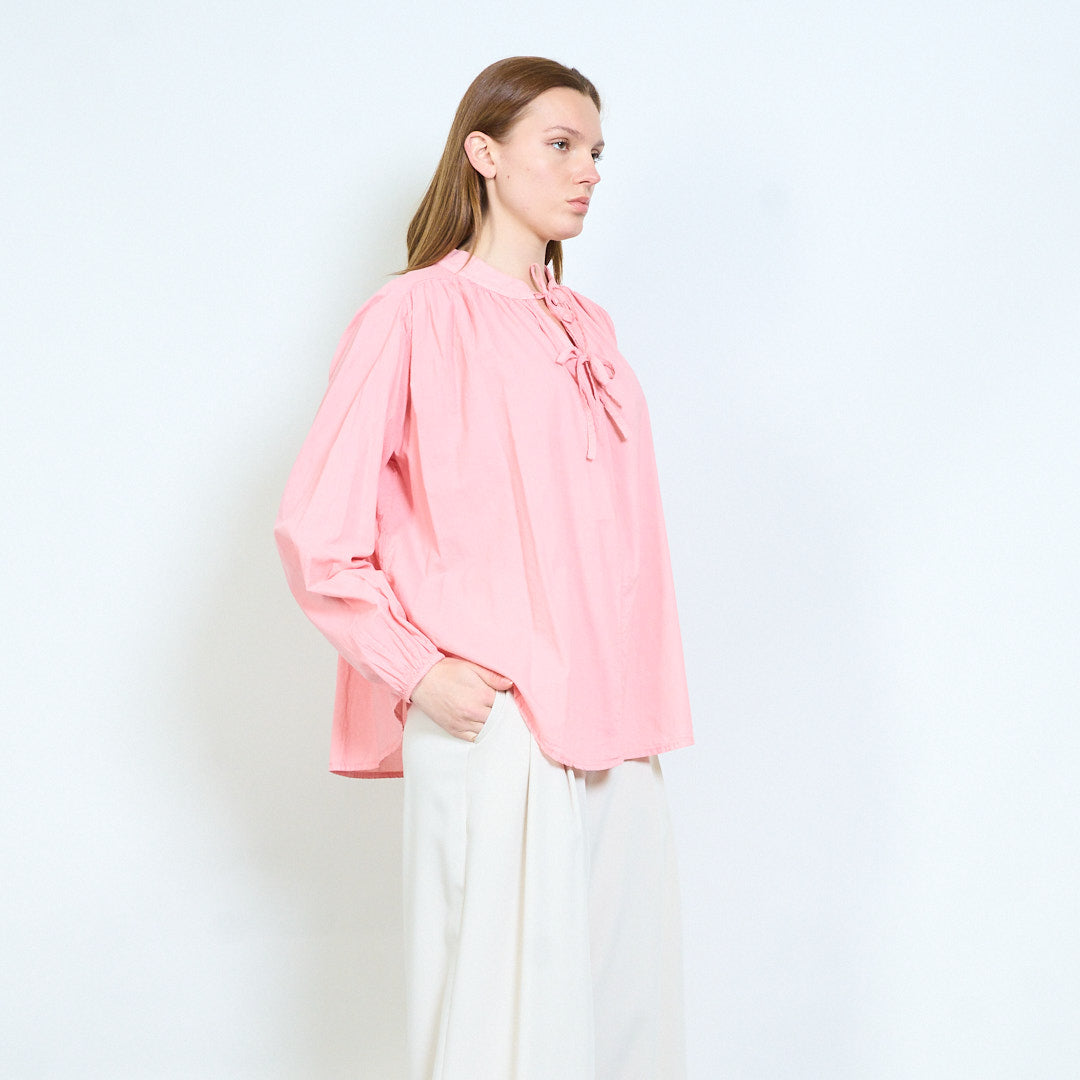 Blouse met strikhals, zacht gerimpeld schouderstuk en relaxte pasvorm in de groothandel