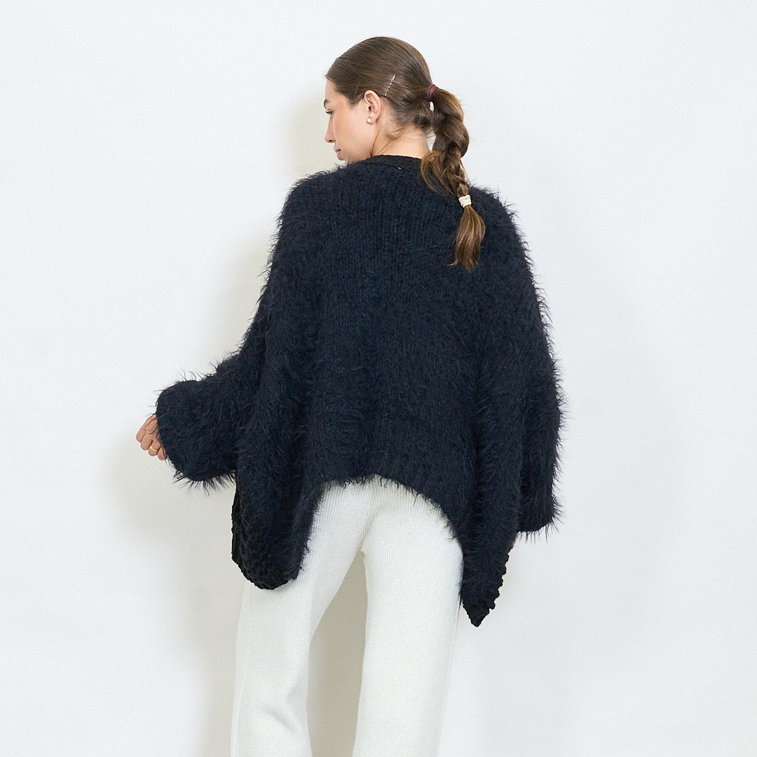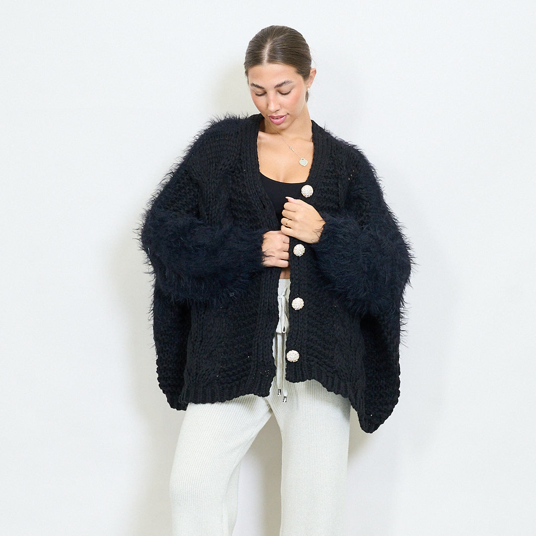 - Zacht fuzzy garen langs mouwen en randen voor extra flair