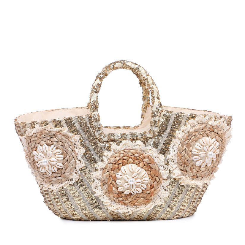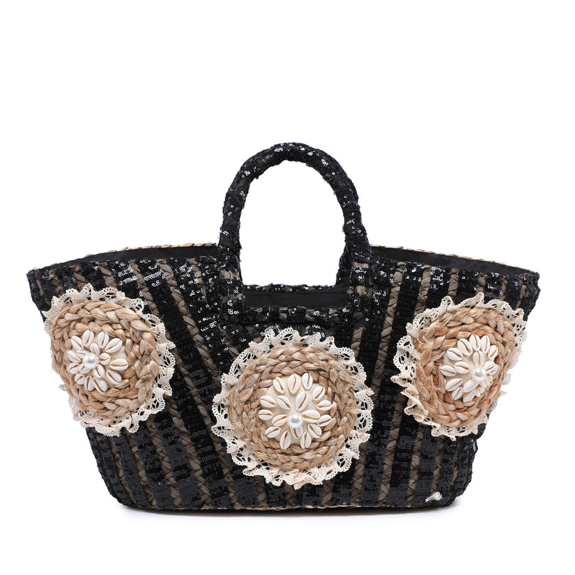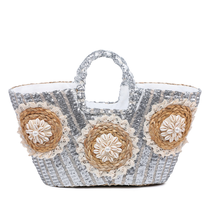 - Beschikt over sprankelende zilveren paillettenstrepen over een geweven stro -basis