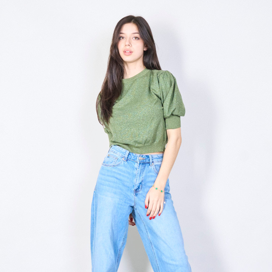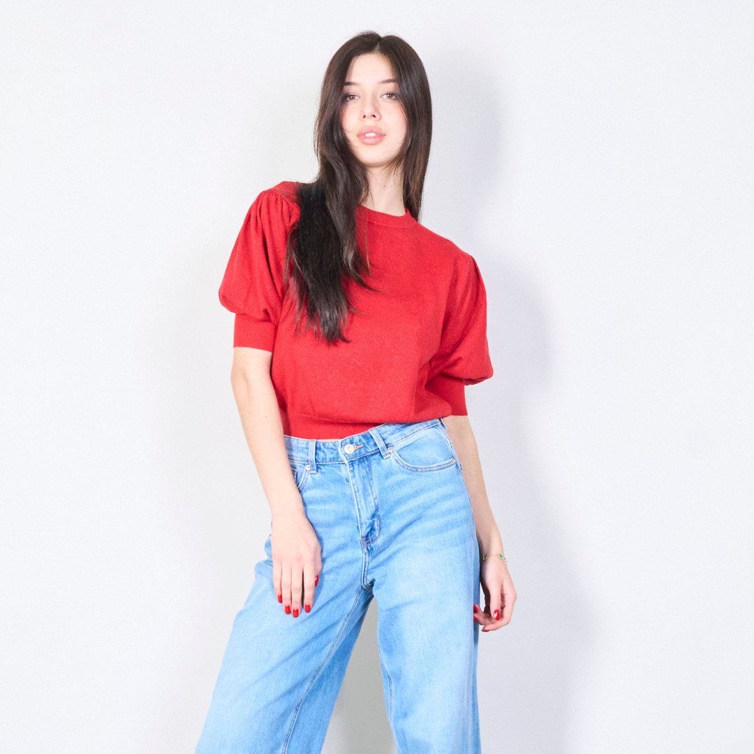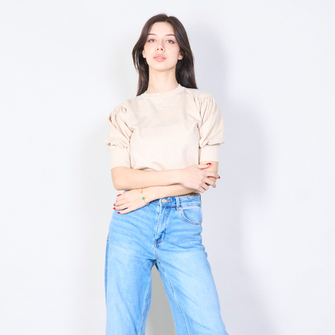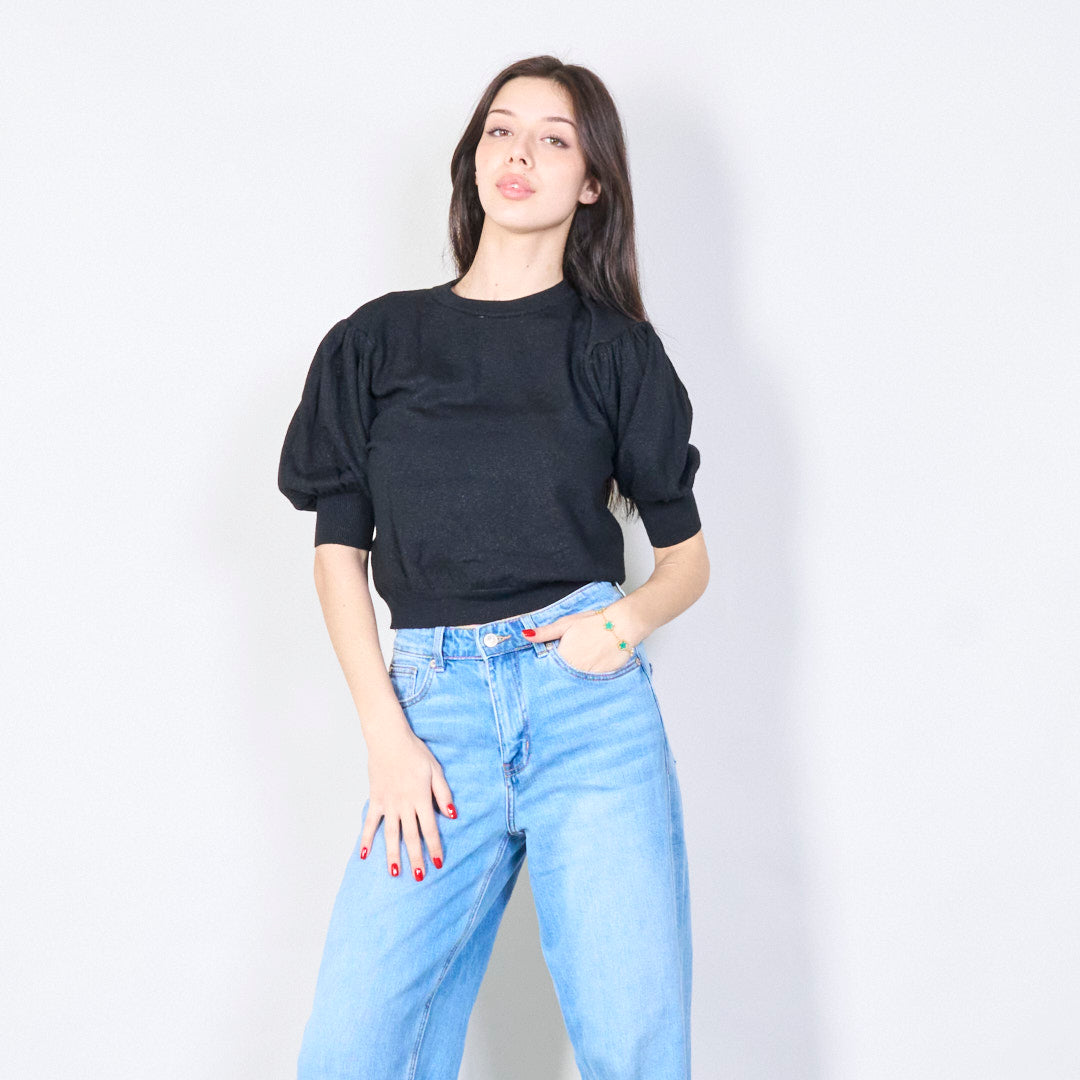 Glinsterende puff mouw gebreide topgroothandel