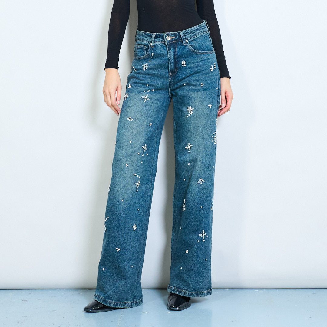 Groothandel jeans met hoge taille en wijde pijpen, versierd met strasssteentjes