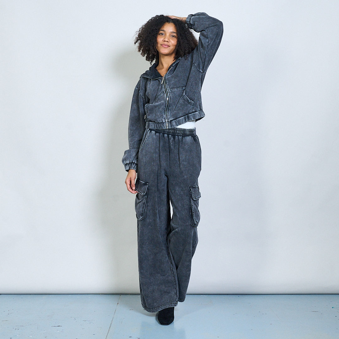 Zip hoodie en vrachtbroeken gewassen loungewear set groothandel