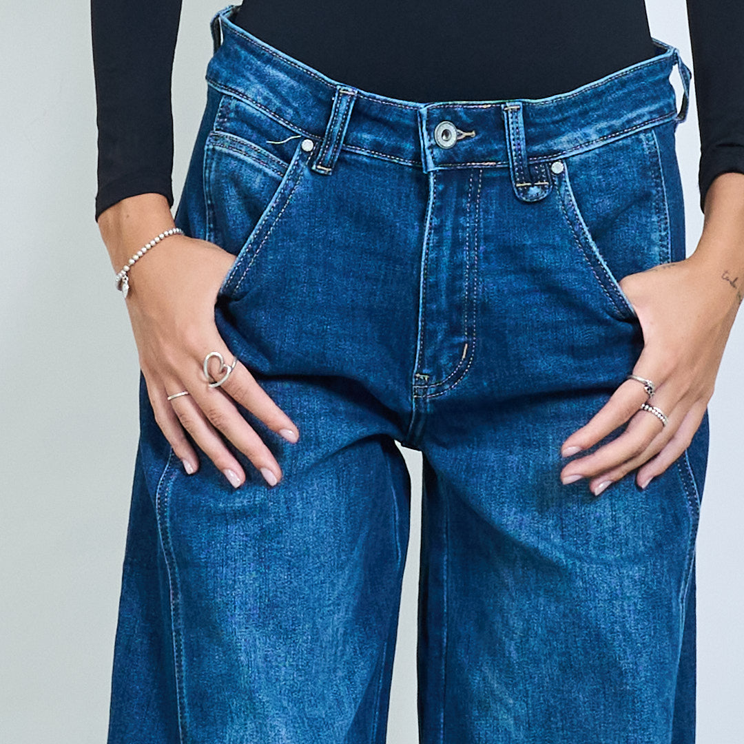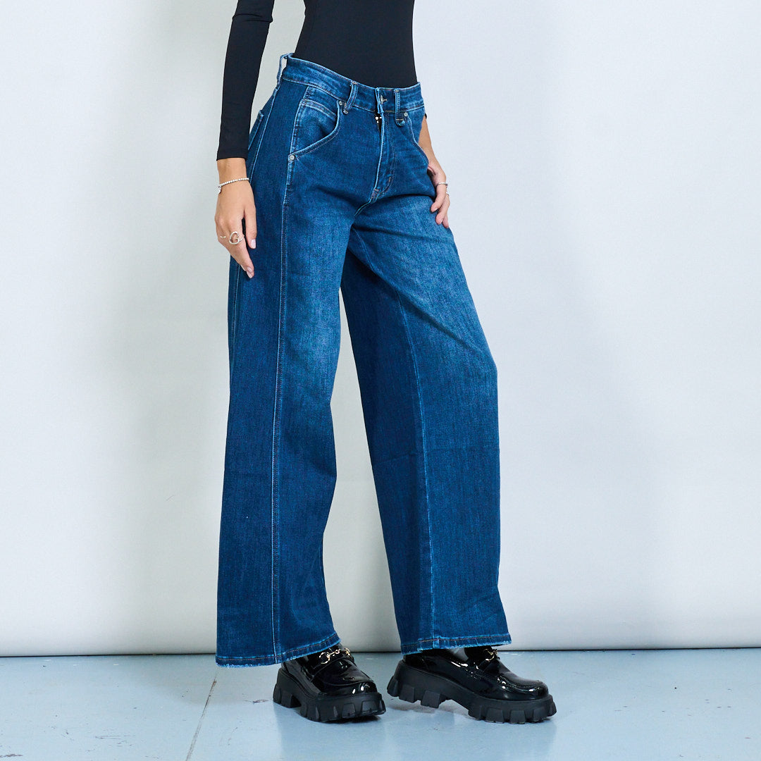 - Klassiek 5-pocket ontwerp met voorste knop en zip sluiting
