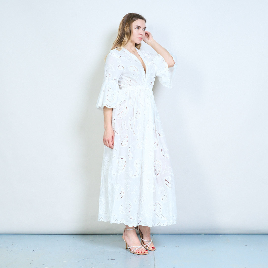 Sprzedam hurtową sukienkę midi z oczkami paisley, marszczoną talią i przewiewnymi długimi rękawami