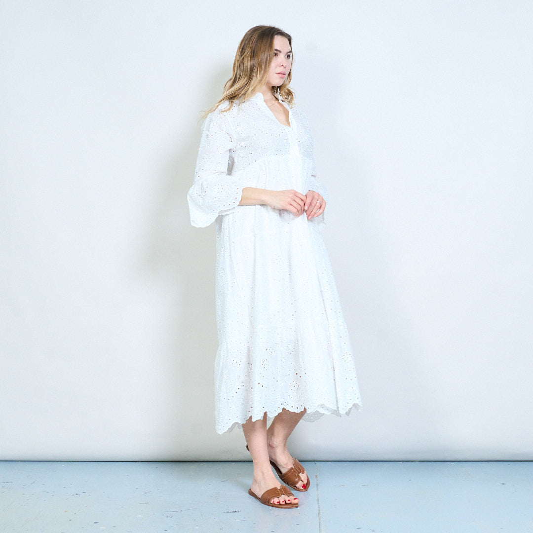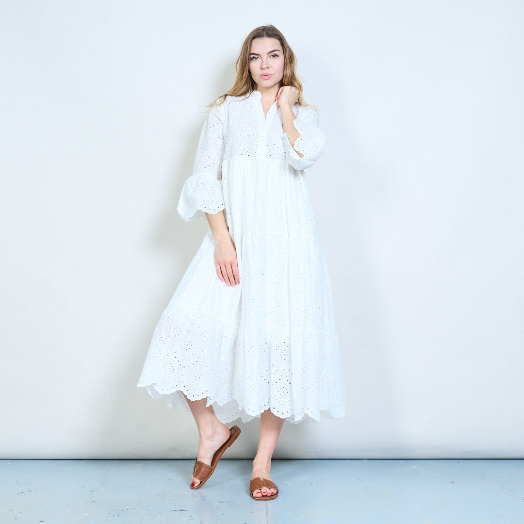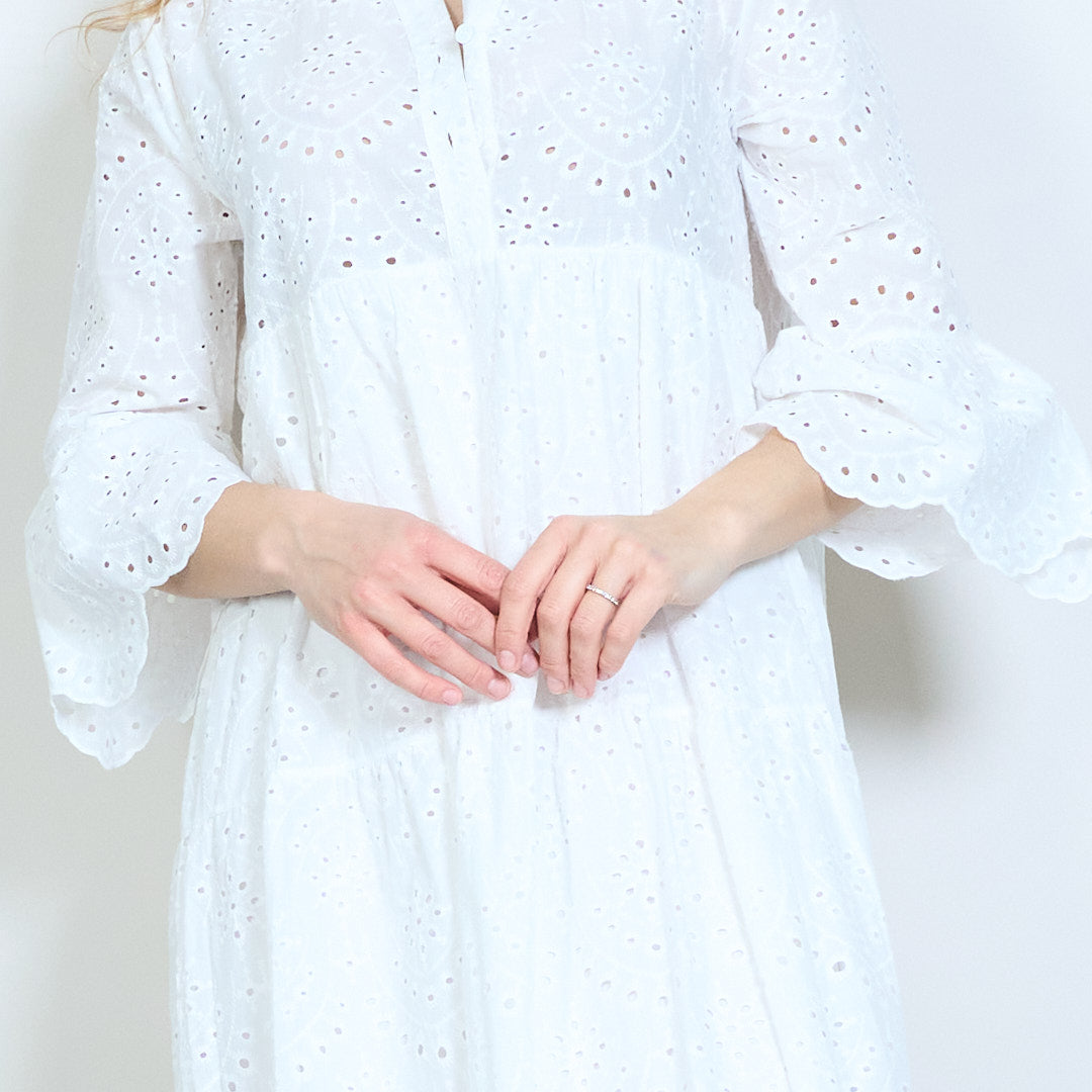 Warstwowa sukienka z kwiatowymi oczkami i rozcięciem pod szyją, z luźnym stanikiem i rozszerzanymi rękawami – hurt