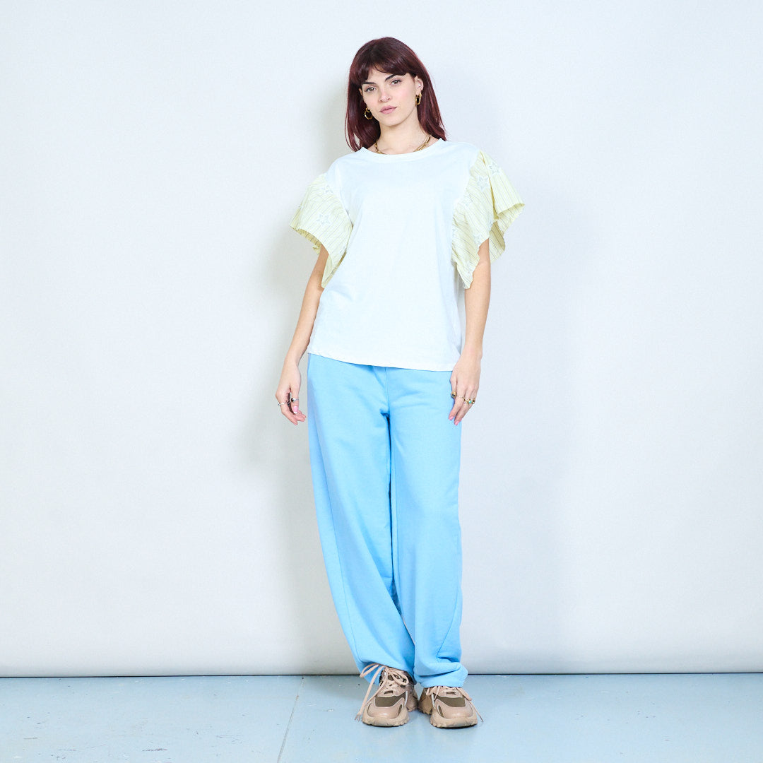 - Panele na rękawach w paski ozdobione haftowanymi kwiatowymi detalami