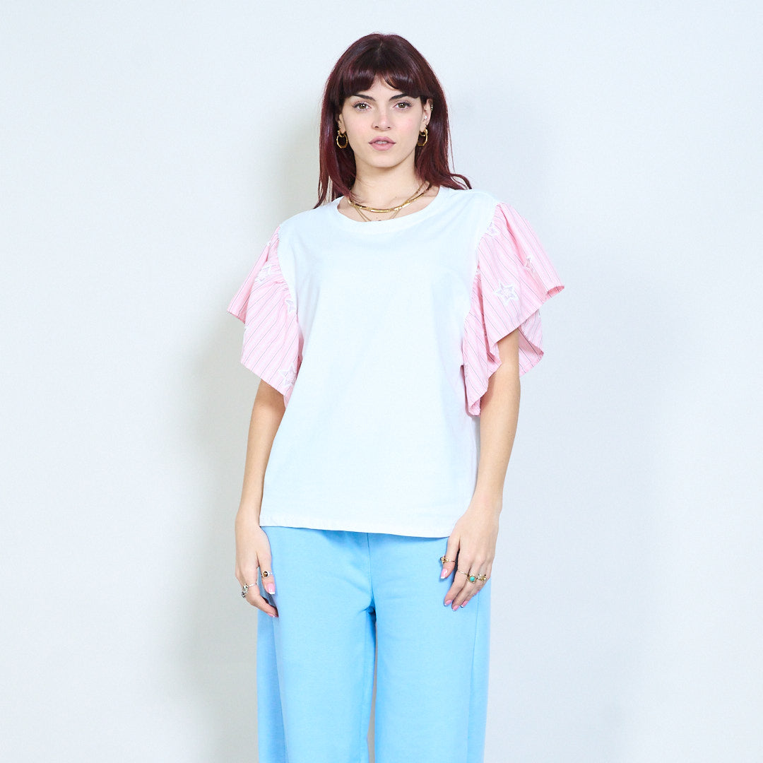 Hurtownia topów z okrągłym dekoltem i haftowanymi kwiatami w paski
