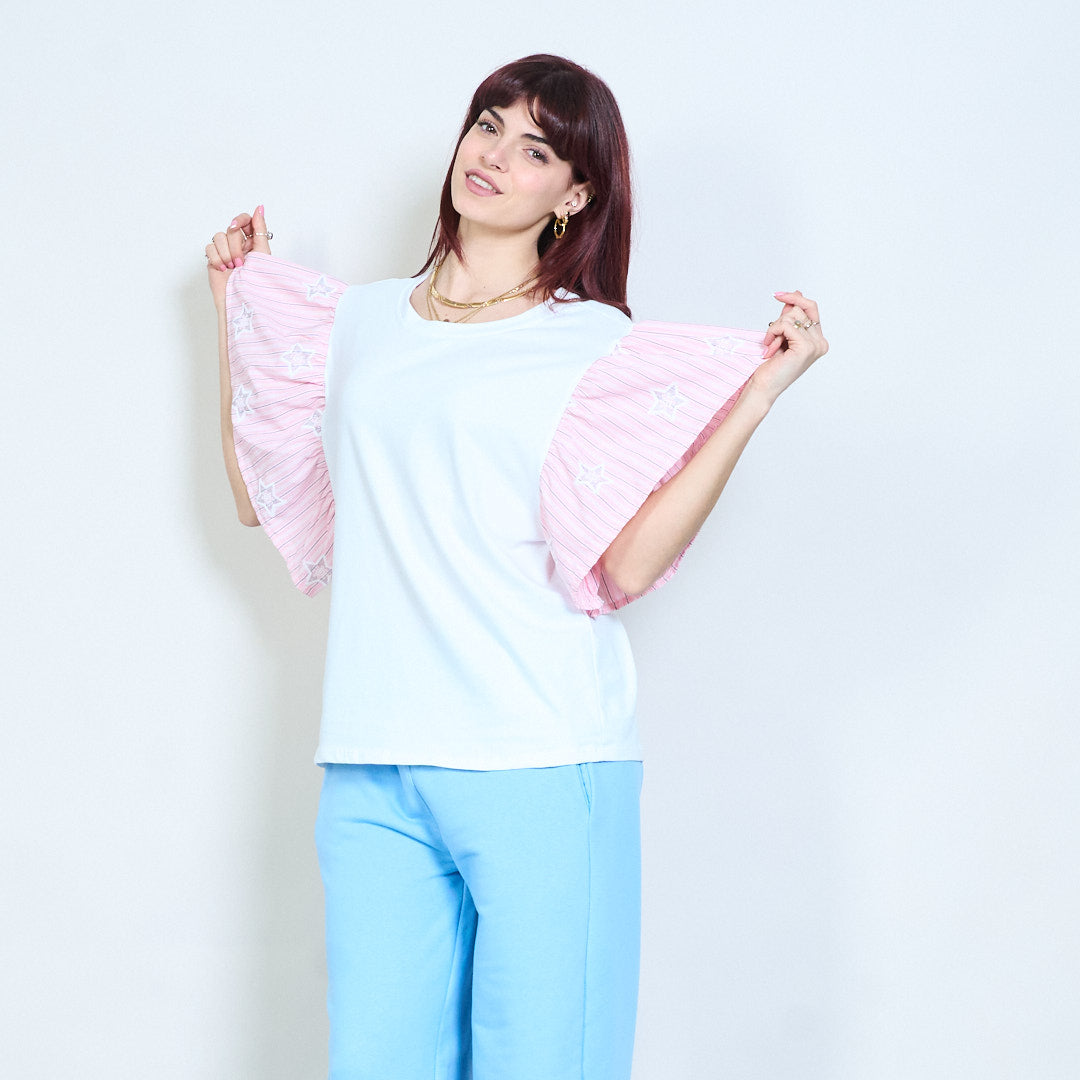 - Miękka konstrukcja korpusu równoważy dekoracyjne cechy rękawów